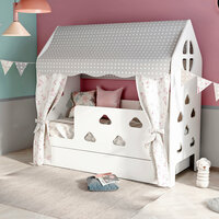 Купить Детская кровать домик с текстилем и ящиком (серый, с принцессами) «Облачка» с доставкой по всей России.
