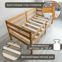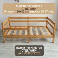 Удобная, компактная, надёжная, экологически чистая и безопасная кровать придётся по душе детям и родителям. Идеально подходит для детей от 3 до 12 лет, для мальчика и для девочки. Кровать с выкатными ящиками, они продаются отдельно. Одинарный бортик, устанавливается на левую и правую сторону. Изготовлена из сосны (натуральное, гладкое дерево), все перекладины толстого сечения без использования МДФ или ЛДСП. Реечное основание под матрас скреплено лентой, что позволяет надежно установить его на кровать. Кроватка представлена в пяти цветах: натуральная (не окрашенная), белая, светло-коричневая, темно-коричневая, комбинированная бело-светлая. Размер спального места кровати 160 х 80. Габариты кровати ДхШхВ 168х87х71, высота кровати от пола до основания 20 см. Детская кровать от 3х лет.