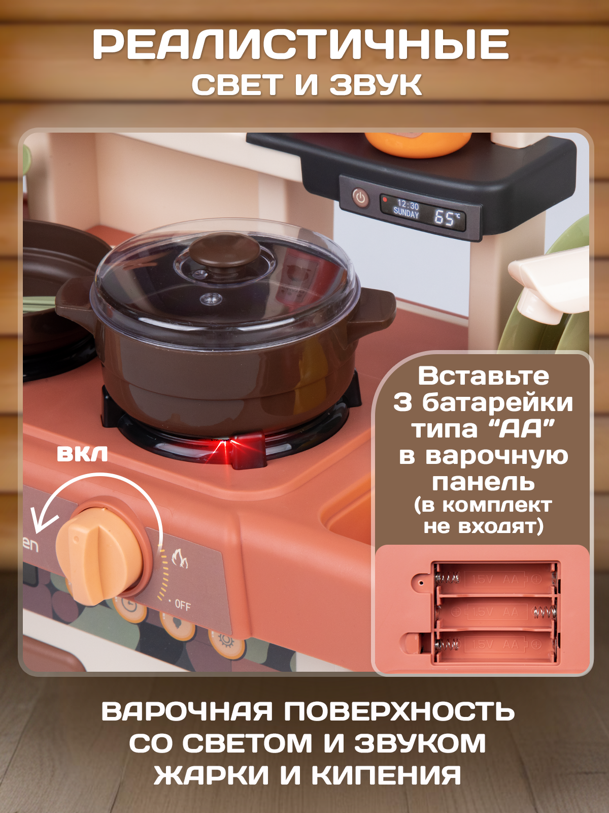 Для работы плиты в детской кухне необходимы 3 батарейки АА (не входят в комплект).