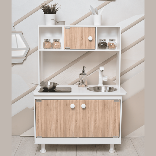 Игровой набор кухни с настоящим краном и мойкой из пищевой нержавеющей стали, брендированной интерактивной плитой SITSTEP, которая издает звуки шипения, бурления готовящейся на плите еды, а также светится при нажатии на кнопки.