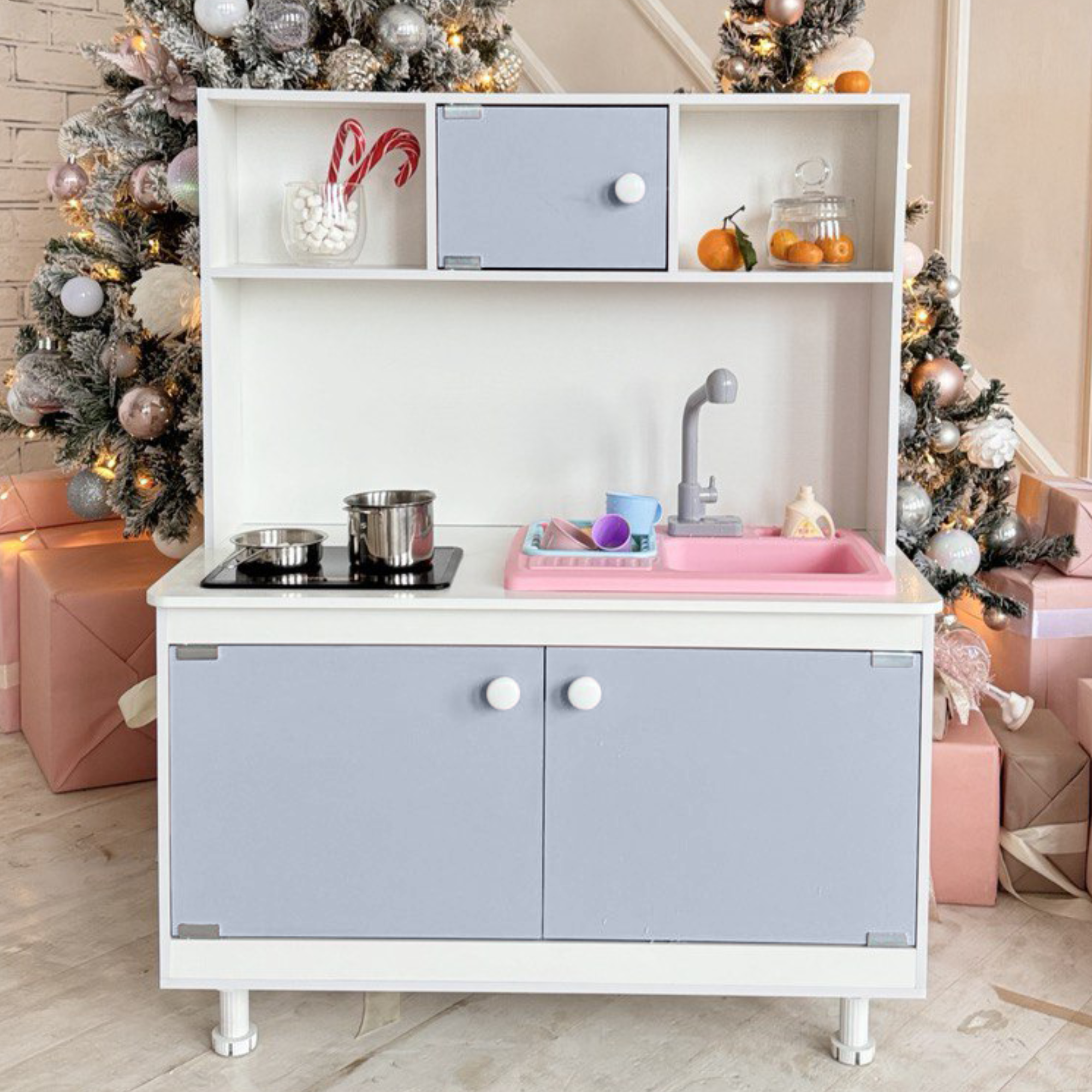 В кухне есть шкафчики и полки для хранения игрушек и аксессуаров.