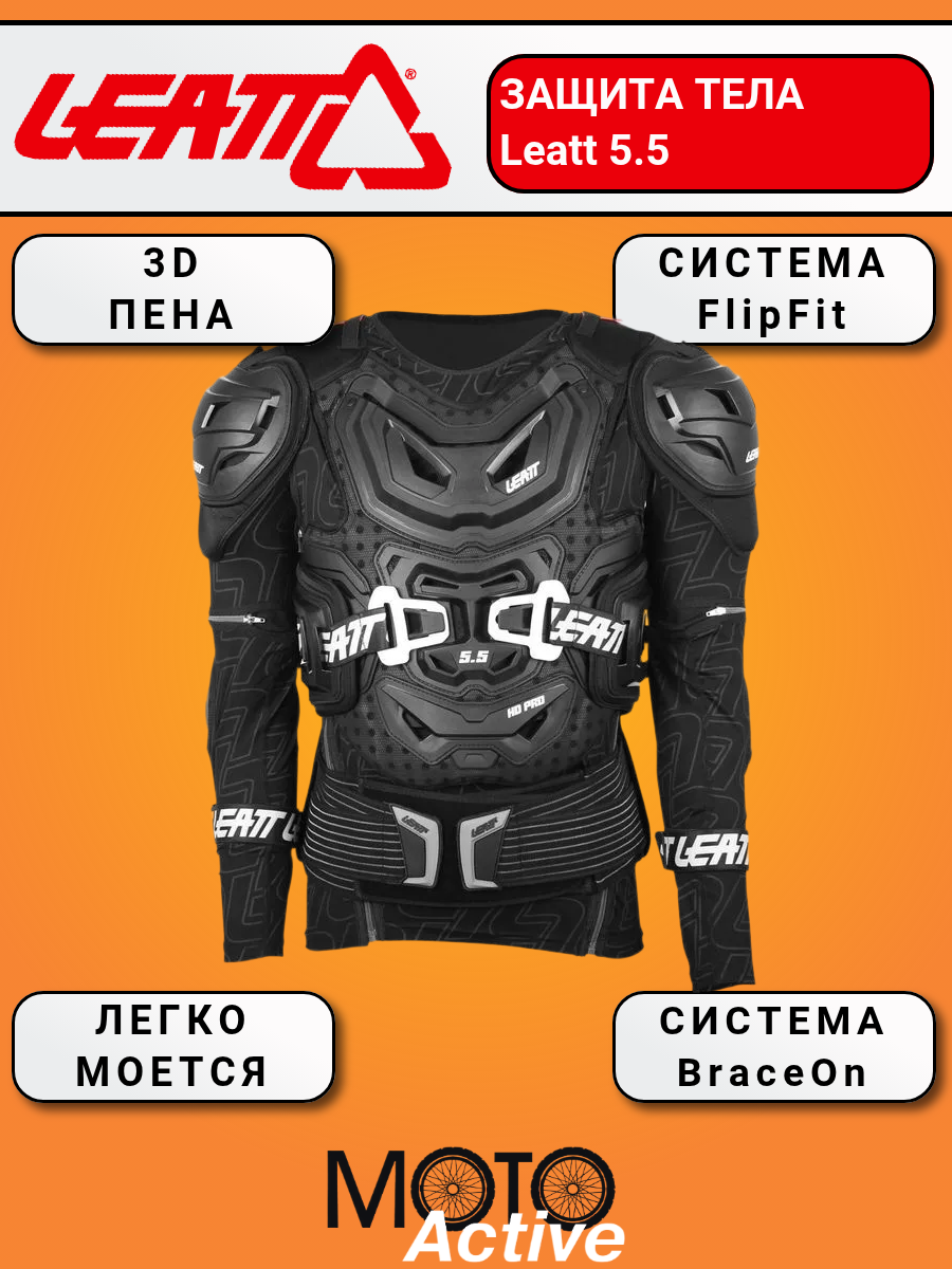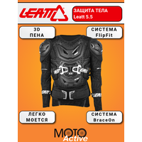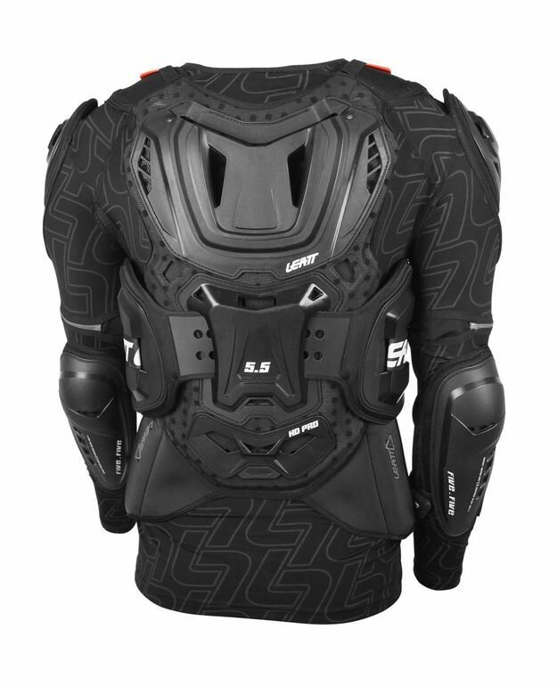 Полная защита тела Leatt-Brace LEATT 5.5 дает всестороннюю защиту и соответствует самым современным стандартам безопасности благодаря многослойному сочетанию твердых внешних панелей защиты груди и спины с вставками из 3DF-пены, которая поглощает энергию удара над самыми уязвимыми частями. Использование уникальной системы фиксации защиты тела и шеи BraceOn с эластичными ремнями максимально снижает скованность движений в защите и позволяет добиться свободы движений райдера