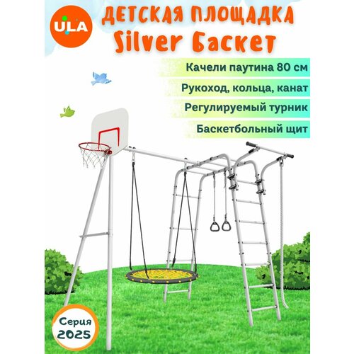 Детский спортивный комплекс "Silver Баскет" предназначен для детей от 3-х лет. Этот уникальный игровой комплекс в стильном сером цвете и удобными качелями не только украсит ваш двор, но и подарит вашим детям часы радости и веселья. Гимнастические кольца и канат позволят детям развивать силу, ловкость и координацию. Качели подарят незабываемые моменты радости и свободы. Ваш ребенок сможет часами играть, развивая физическую активность и уверенность в себе! Баскетбольный щит с кольцом — это незаменимый элемент игры в баскетбол. Щит выполнен из прочного и устойчивого к воздействиям окружающей среды материала, что гарантирует его долговечность. Благодаря специальной конструкции, он легко устанавливается и надежно фиксируется на уличном комплексе. Благодаря продуманному дизайну и качественным материалам, наш комплекс не только способствует физическому развитию детей, но и привносит уютную атмосферу игр и веселья на свежем воздухе. Габаритные размеры: длина - 2,35 м ширина – 1,90 м высота - 2,40 м Максимальная нагрузка на комплекс: 100 кг Максимальная нагрузка на навесное оборудование: 50 кг Комплектация: - 2 шведские стенки - турник регулируемый по высоте - рукоход - канат - кольца гимнастические - баскетбольный щит с кольцом - качели гнездо-паутина 80 см