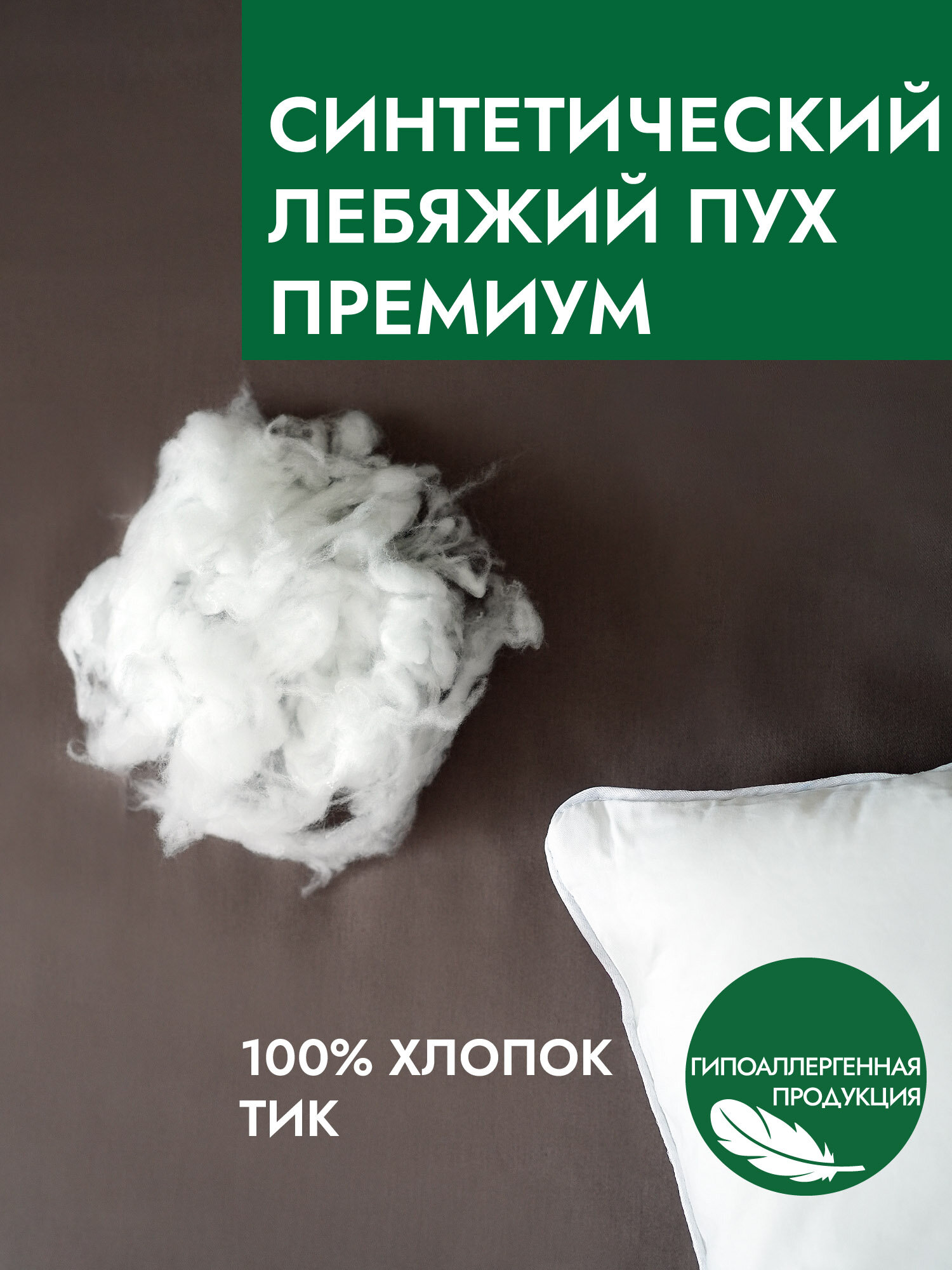Мы изготовили подушку из белоснежной, 100% хлопковой ткани — тик. Наполнителем подушки является гипоаллергенное 100% полиэфирное синтетическое микроволокно премиум класса — безопасный и экологичный аналог натурального пуха, называемый "лебяжим пухом".