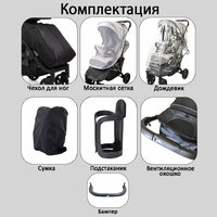 | Комплектация | антимоскитная сетка, бампер, дождевик, капюшон, накидка на ноги, подстаканник, солнцезащитный козырек, сумка для хранения и переноски |
