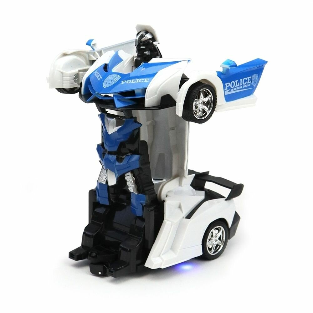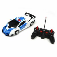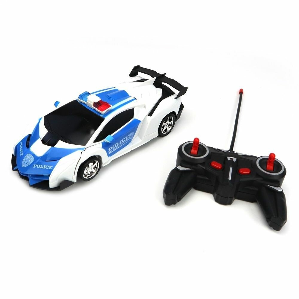 Игрушка на радиоуправлении — Робот-трансформером 2 в1! Большая полицейская машина на радиоуправлении - находка для любителей полиции и трансформеров, размеры машинки 21х10х7 см. Каждый мальчик мечтает о таком роботе трансформере, который может трансформироваться из стильной машинки в мощного робота. Наш робот трансформер на радиоуправлении станет идеальным подарком для мальчиков. Эта быстрая машинка на пульте управления гарантирует увлекательные гонки. Механизм машинки позволяет развивать ей высокую скорость. Детская машинка легко превращается в робота трансформера одним нажатием - одной кнопки на пульте управления. Размер робота 20х10х16 см. С помощью дистанционного пульта управления машинка может двигаться во всех направлениях - вперед, назад, вправо и влево. При этом ездить может как машинка, так и робот. На нижней части корпуса игрушки трансформера установлен световой индикатор, который горит и мигает во время движения. Корпус машинки выполнен из качественного безопасного ABS пластика. Прорезиненные колёса обеспечивают отличное сцепление с поверхностью для быстрой езды и лёгкого торможения. Для полноценной игры с машинкой потребуется дополнительно приобрести 5 батареек АА (в пульт управления 4 ГГц - 2 штуки, в машинку - 3 штуки), в комплект с игрушкой батарейки не входят. Игрушки для детей на радиоуправлении становятся все более популярными, и наш трансформер на радиоуправлении не исключение! Робот трансформер для мальчика — это не просто игрушка, а друг, который всегда готов к приключениям. На пульте дистанционного управления расположены 2 кнопки, однако функциональна только одна, которая отвечает за трансформацию машинки. Левая кнопка НЕ ИМЕЕТ ФУНКЦИОНАЛА. Машинка робот трансформер станет прекрасным подарком на день рождение и Новый год. Робот трансформер игрушка для мальчиков упакована в красивую коробку (24х13х8 см) и идеально подходит в подарок.