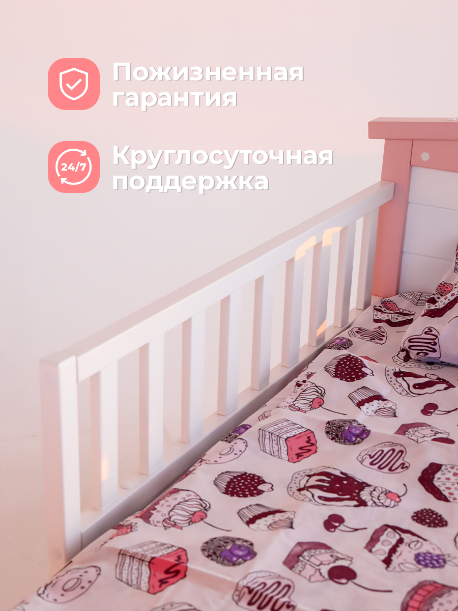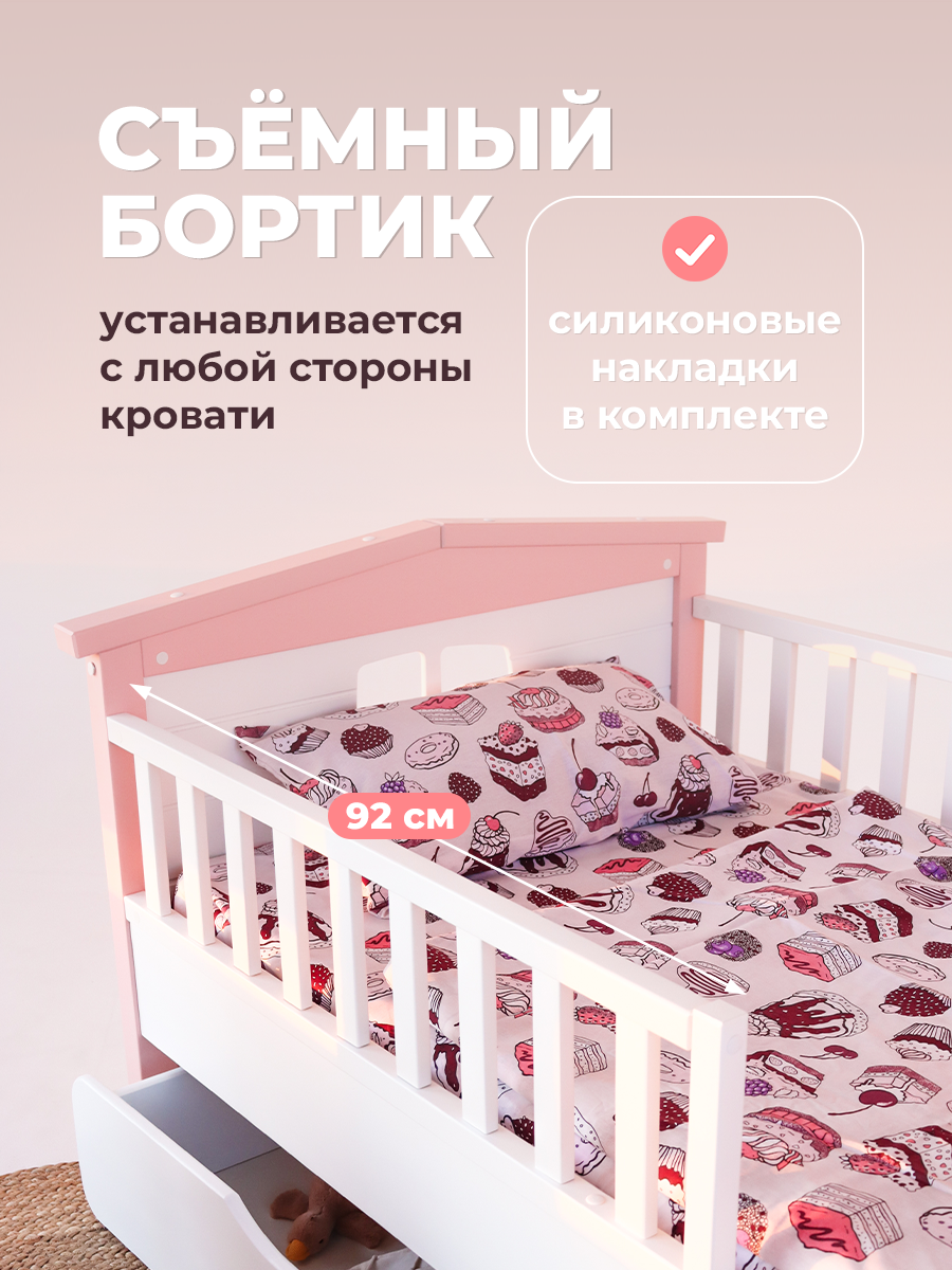 Удобство и функциональность: Кровать оснащена съемным бортиком, который обеспечивает дополнительную безопасность для вашей принцессы. В первый год жизни, можно ставить 2 бортика, а позже оставить 1 или убрать оба. Вместительный ящик позволит хранить пастельное белье, игрушки и все необходимые вещи, которые нужно быстро спрятать, чтобы комната всегда оставалась аккуратной и уютной.