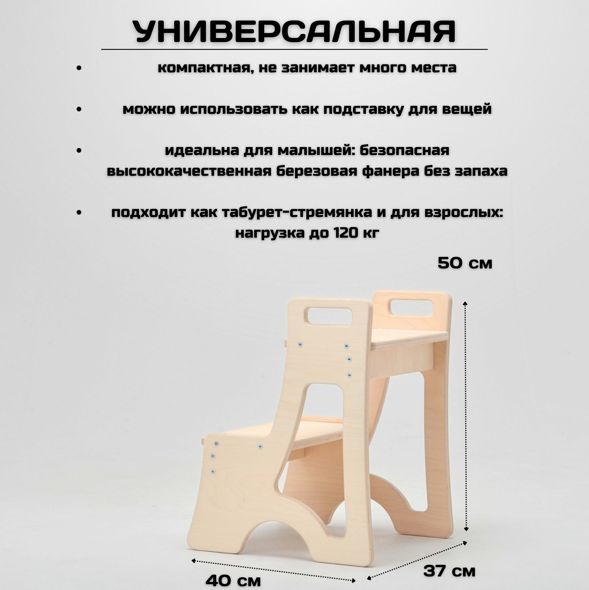 Табурет-ступенька поможет малышу самостоятельно осваивать мир. Никакого пластика - только берёзовая фанера 18мм. Выдержит и взрослого человека (до 120кг). Идеально впишется как интерьерное решение для детской. Табурет может служить как подставка. Табурет ступенька - это прочное и качественное изделие из дерева, выполнен из березовой фанеры ФК 2/2. Как итог, данный табурет - это детская мебель и просто незаменимый помощник в доме. Можно покрыть ступеньку маслом, лаком, акрилом или раскрасить её вместе с ребёнком.