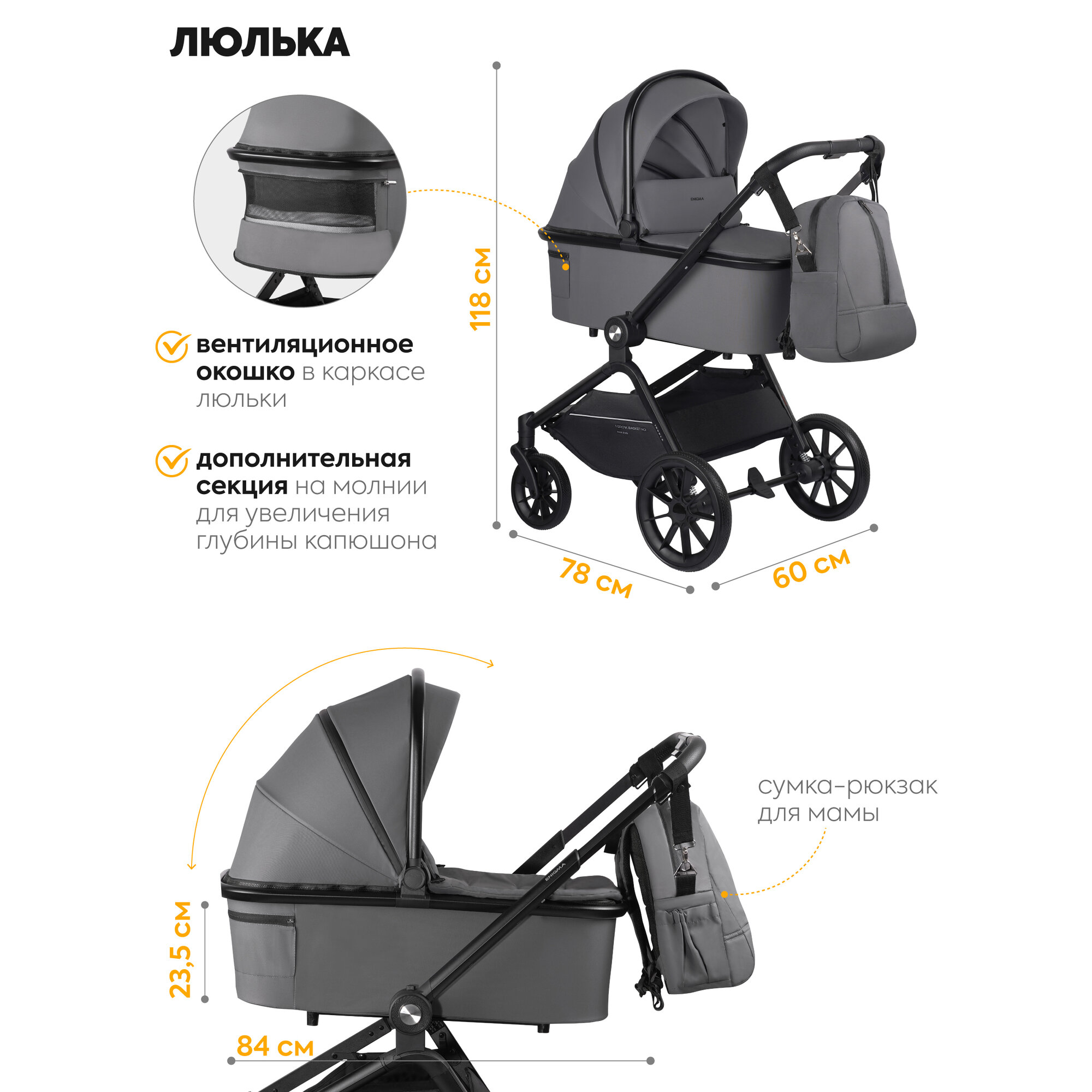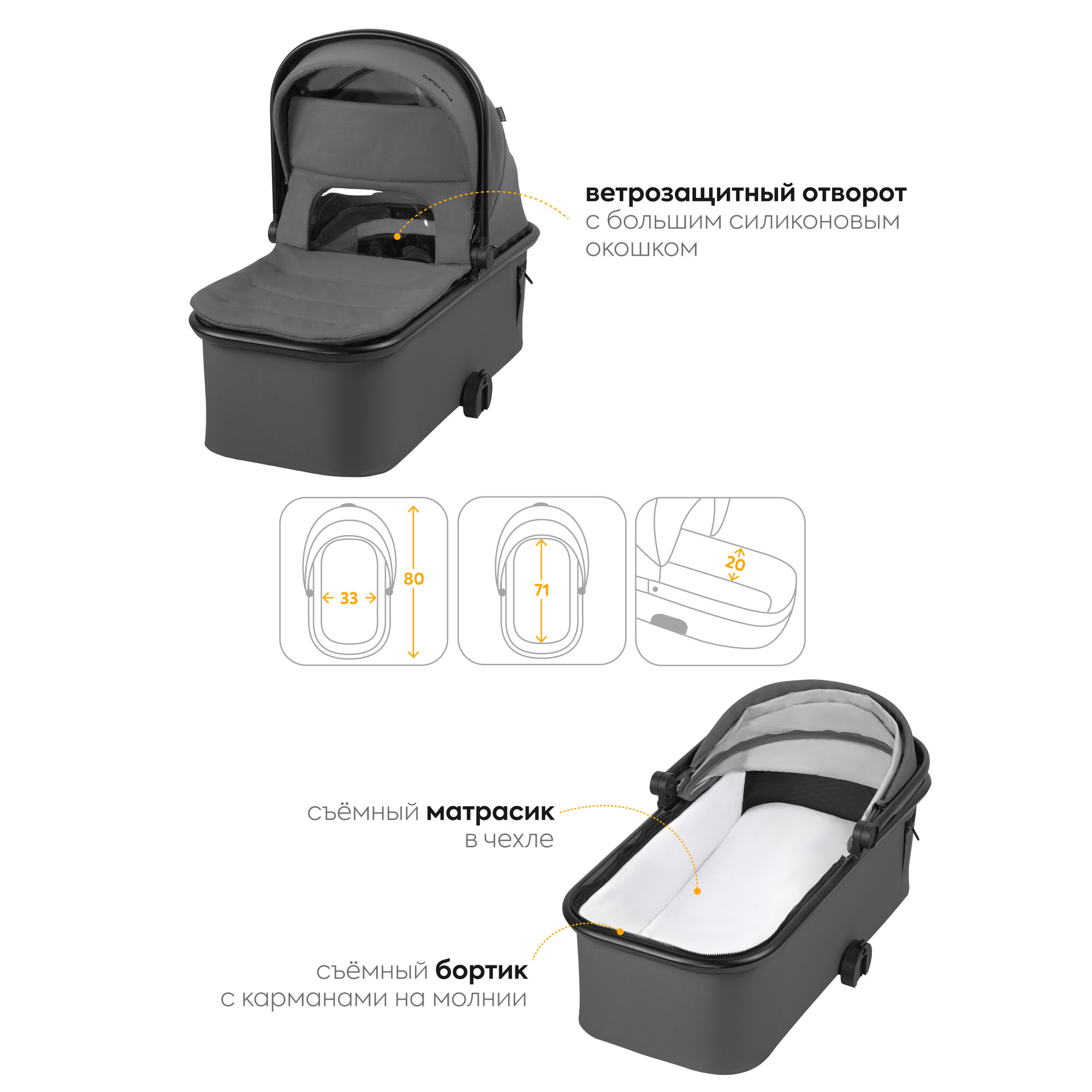 | Комплектация | антимоскитная сетка, капюшон, накидка на ноги, солнцезащитный козырек, сумка |
