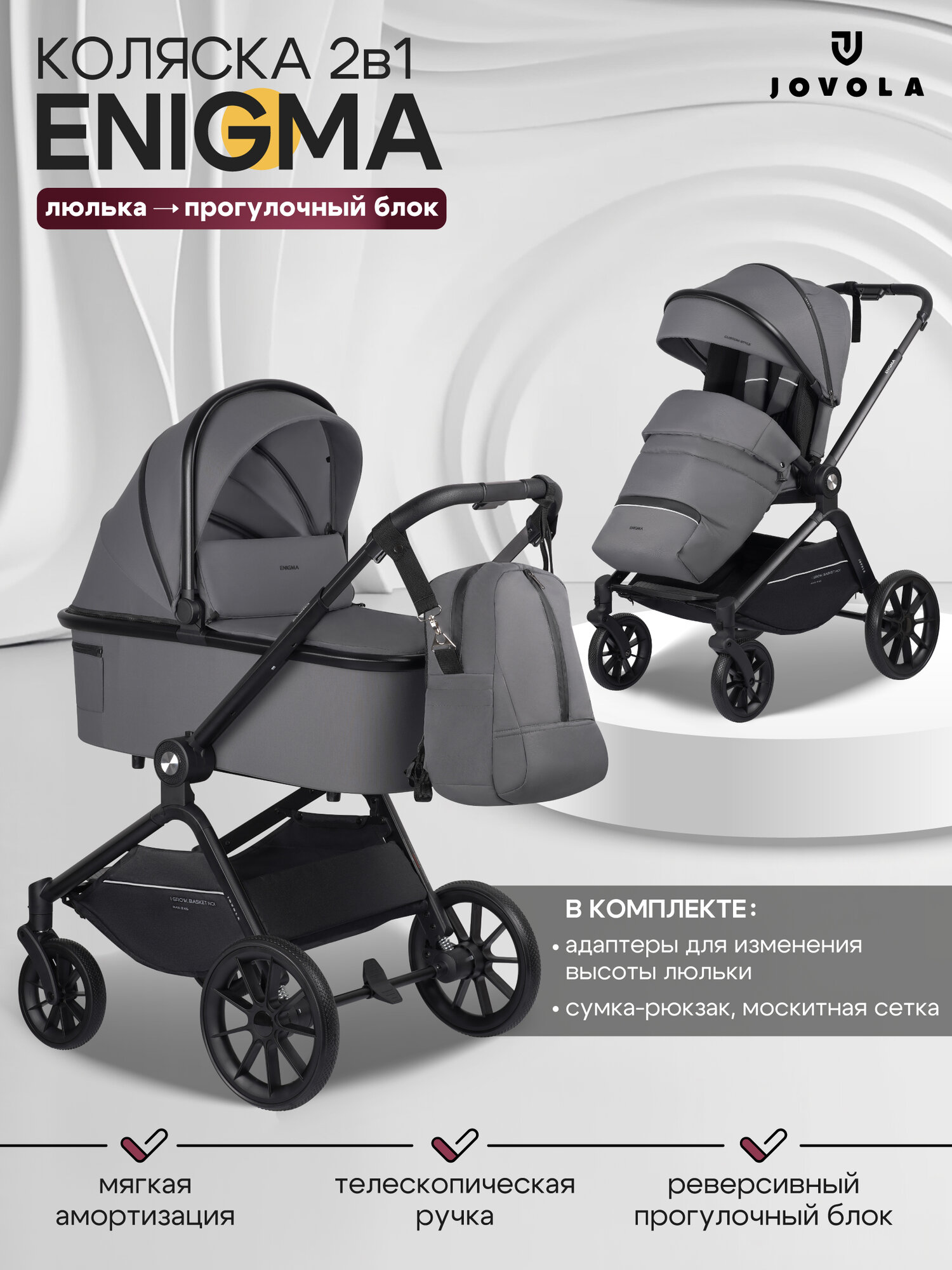 Детская универсальная коляска 2 в 1 Jovola Enigma, всесезонная с реверсивным блоком, серый: сравнение цен, характеристики, фото, актуальное наличие и цены.