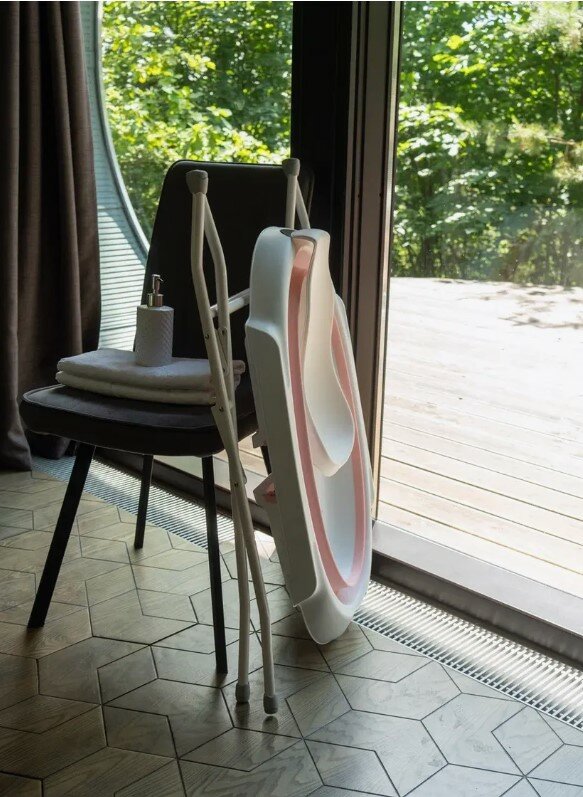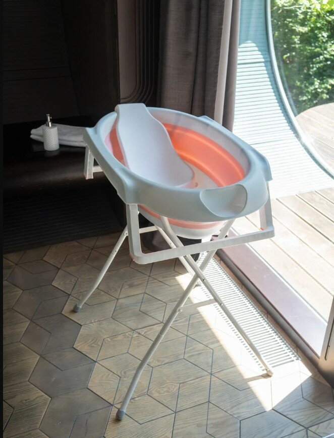 Ванночка вместе с подставкой весит чуть больше 5 кг, что позволяет с лёгкостью перемещать её по дому и брать с собой в дорогу. В сложённом виде ванночка занимает минимум места, а интуитивно понятное складывание и раскладывание становится преимуществом для родителей с насыщенным графиком.