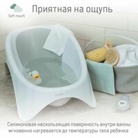 Ванна идеально подходит для детей от новорожденного до 12 месяцев, поскольку ванна растет вместе с ребенком в два этапа. Сначала от 0 до 6 месяцев в положении лёжа, а затем в положении сидя от 6 до 12 месяцев. Изготовленная из прочного, устойчивого к плесени материала, ванна гигиенична, ее легко чистить и хранить