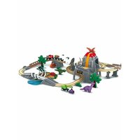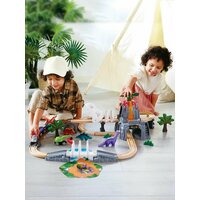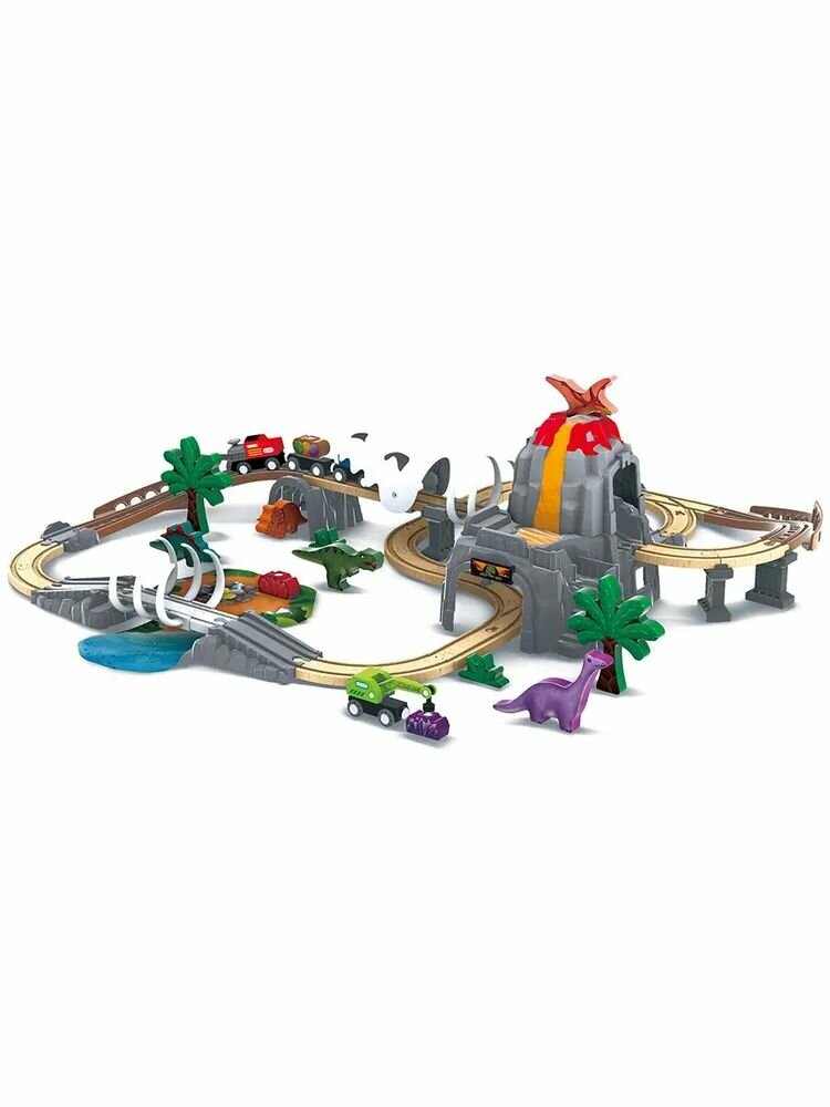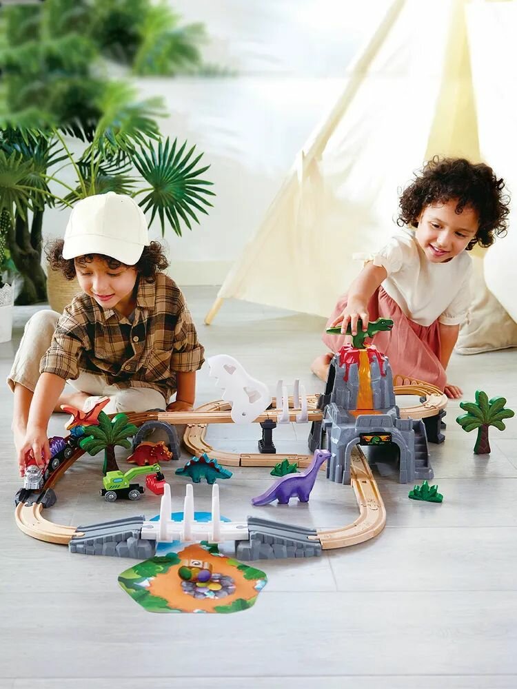 Замечательная игрушка от торговой марки Hape надолго увлечёт маленького любителя дорожных приключений. Дополнительные детали, такие как: деревья, фигурки динозавров, элементы ландшафта помогут ребёнку погрузиться в мир юрского периода. Вагоны паровоза легко соединяются друг с другом при помощи магнита и без труда входят в любой поворот.