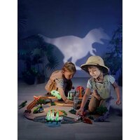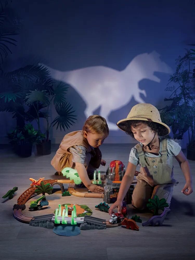 Игровой набор деревянная железная дорога для малышей «Парк динозавров» с элементами, светящимися в темноте, 58 деталей.