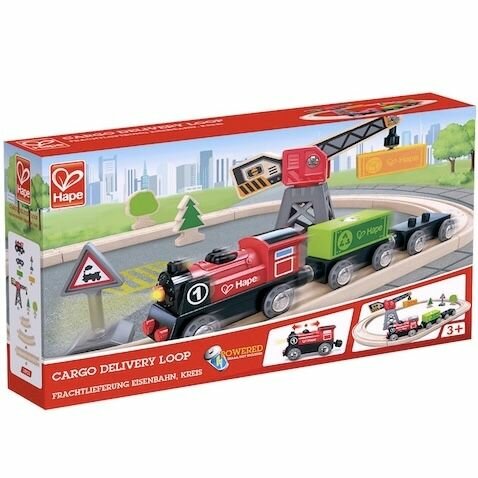 | Дополнительная информация | локомотив, два вагона, грузы, погрузочный кран, дорожные знаки, деревья, фигурка человека, автомобиль; магнитная сцепка вагонов |