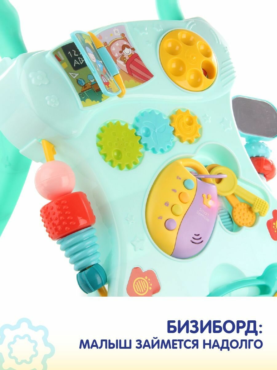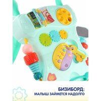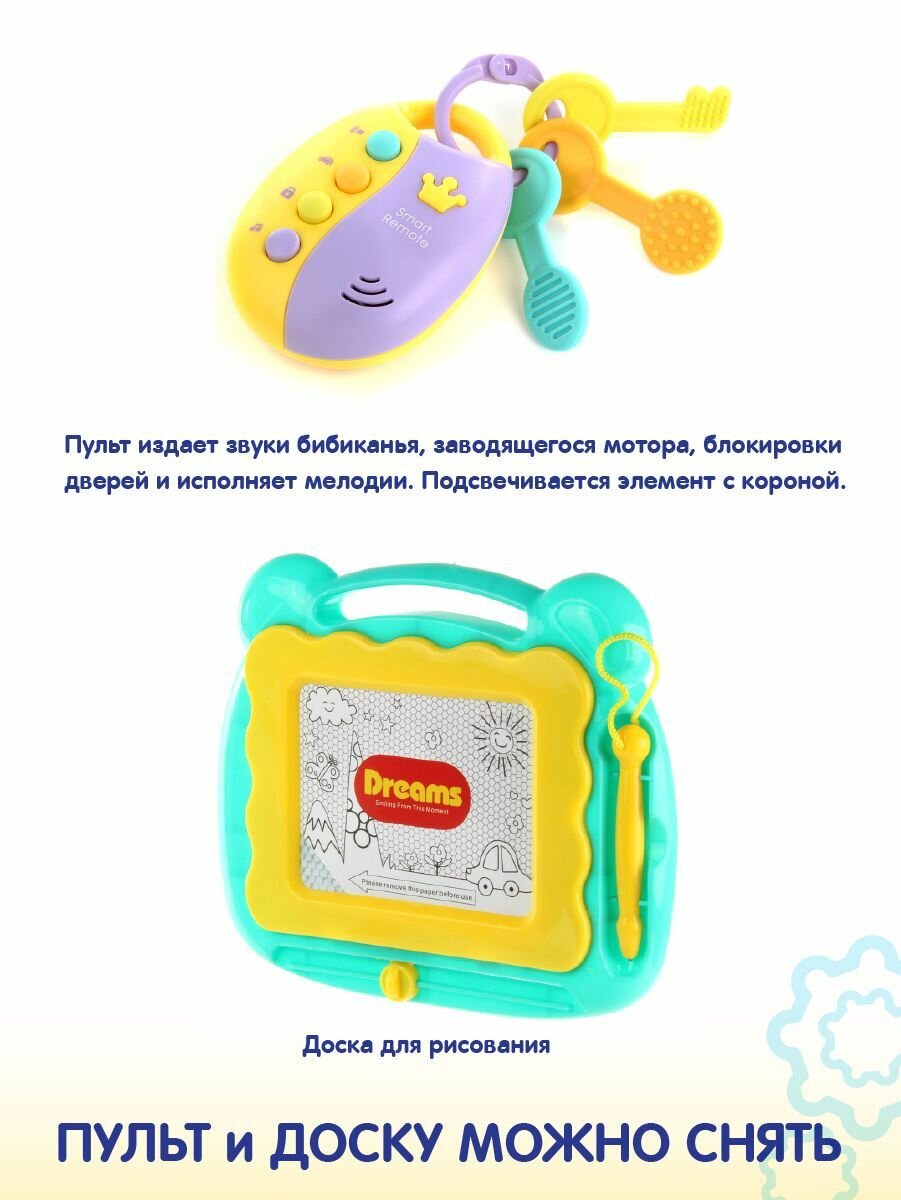 Многофункциональные детские ходунки помогут сделать малышу самые важные первые шаги в жизни. Каталка ходунки с игровой панелью оформлена в очень милом и приятном дизайне, яркой расцветке. В комплект входят каталка, доска для рисования и пульт. Каталка легко собирается и разбирается, катается вперед и назад, имеет множество интересных и разнообразных элементов на лицевой панели. Страничку книжки можно переворачивать. Диск телефона крутится, на циферблате в отверстии диска будет показываться цифра, ребенок познакомится со счетом. Шестеренки вращаются. По бокам каталки есть вращающиеся фигурки и зеркальце, зеркало можно наклонить в сторону. На доске удобно писать, изучать буквы и цифры, написанное легко стирается путем передвижения рычажка под доской. На задних колесах интерактивной игрушки для детей есть силиконовые нескользящие прокладки. Пульт издает звуки бибиканья, заводящегося мотора, блокировки дверей и исполняет мелодии, переключать мелодии можно повторным нажатием кнопки с изображением ноты. При нажатии кнопок на пульте подсвечивается элемент с короной. Ключики сделаны из мягкого материала, можно использовать в качестве прорезывателей. Игровой комплекс для новорожденных, как и бизиборд и сортеры, поможет развить координацию движений, зрительное и слуховое восприятие, а также мелкую моторику ручек и тактильные навыки, поэтому монтессори очень важны в развитии ребенка. Такой детский игровой развивающий центр, как и толокар, беговел или пушкар, станет замечательным подарком детям, как мальчику, так и девочке на день рождения, новый год или любой другой повод. Развивалка для малышей предназначена для детей до 3 лет. Пульт работает от 2 батареек ААА, не входят в комплект. Изготовлено из высококачественного и безопасного полимерного материала. Размеры ходунков в собранном виде 33х41х45 см. Размеры пульта без учета ключиков 7х3,5х10 см. Размеры коробки 45,5х11х34 см.