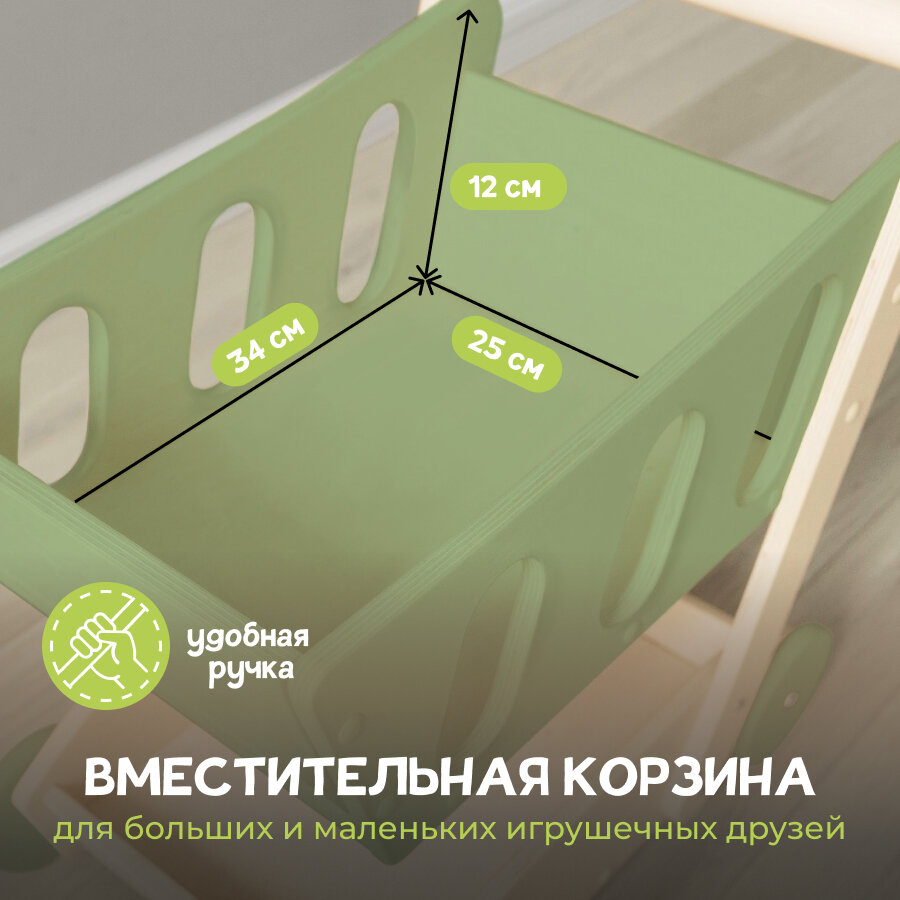 Детская игровая тележка "Корзина" от Pappado - это незаменимый помощник для малышей от 12 месяцев до 3 лет. Она выполнена в оливковом цвете с лакированным покрытием, что придает ей стильный и современный вид.