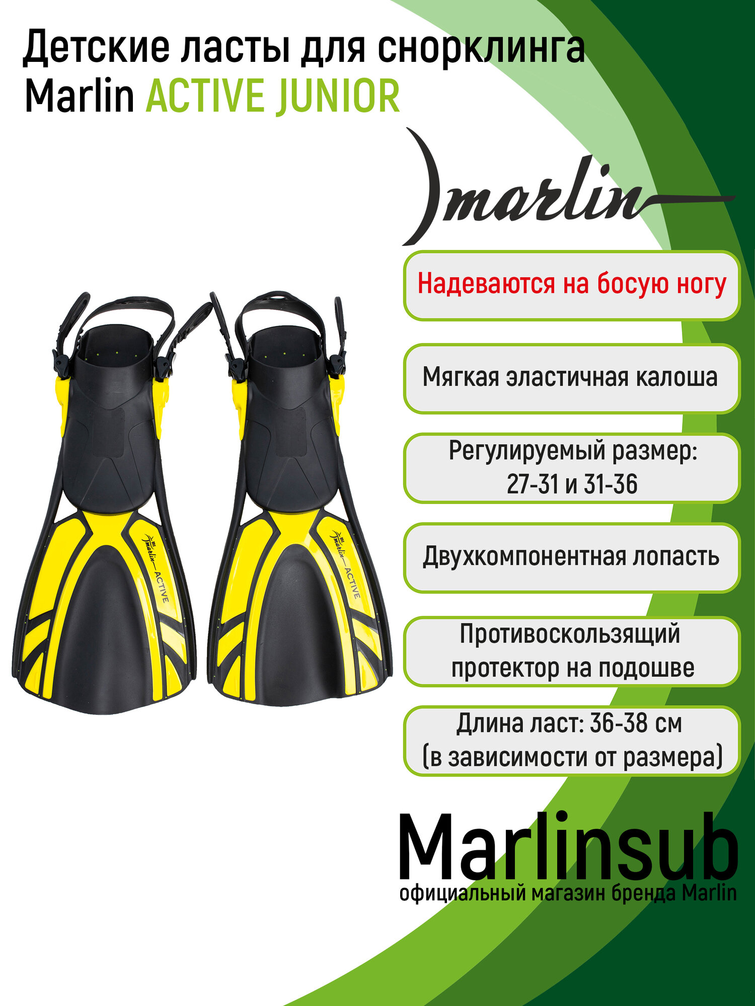 Детские ласты для снорклинга Marlin ACTIVE JUNIOR 27-31 (S), зеленый