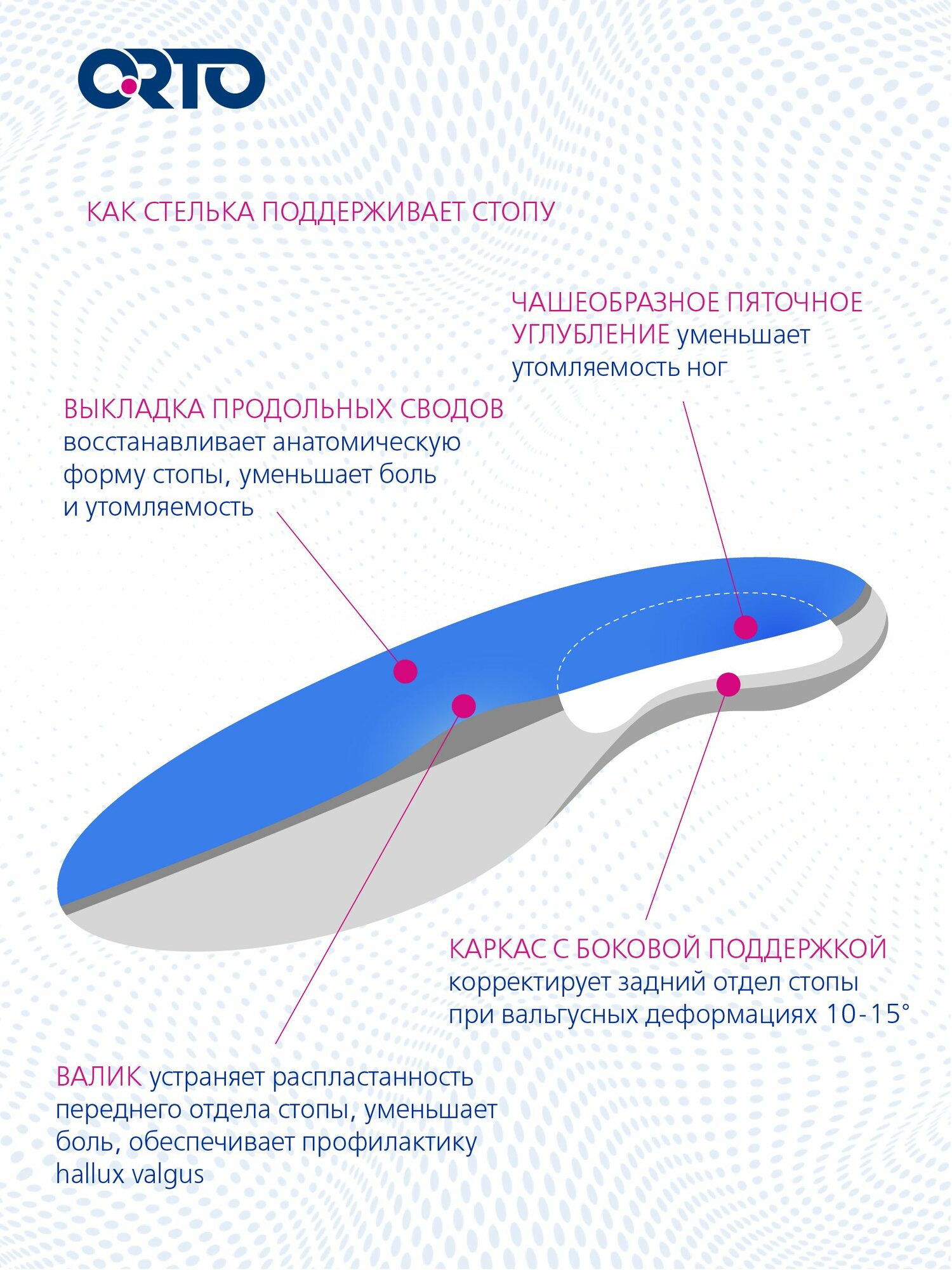 | Показания | артрит/артроз, беременность, вальгусная деформация, варикоз, варусная деформация, деформация нижних конечностей, диабет, дисплазия соединительной ткани, искривление позвоночника, лишний вес, натоптыши, повышенная нагрузка на ноги, полая стопа, поперечное плоскостопие, продольно-поперечное плоскостопие, продольное плоскостопие, пяточная шпора |