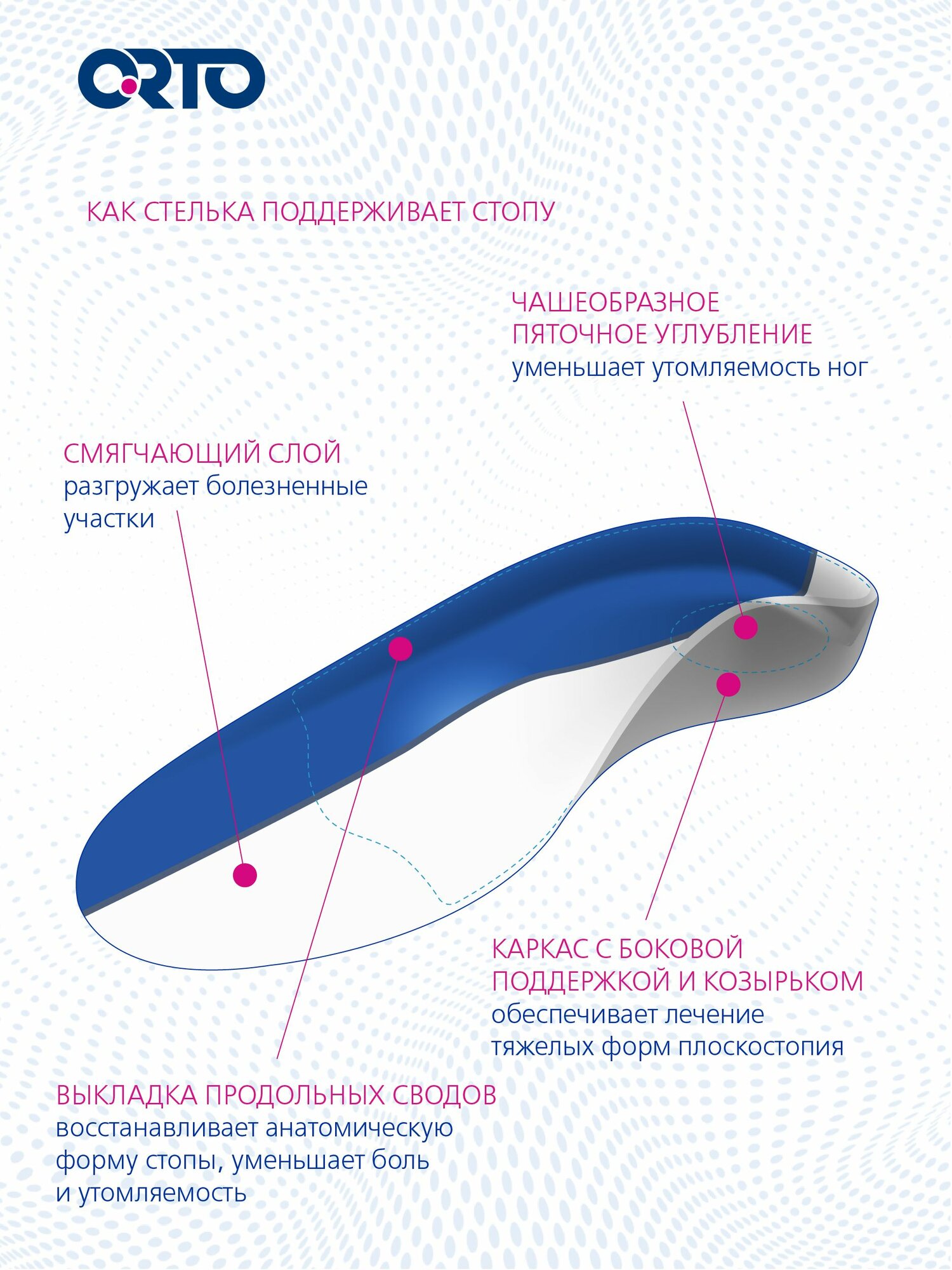 | Дополнительная информация | Ортопедические стельки с динамическим каркасом, продленным до уровня головок плюсневых костей. Характеризуются выраженной выкладкой продольных сводов и минимальным метатарзальным валиком. Имеют смягчающий слой из SBR-латекса, выраженную боковую поддержку и чашеобразное углубление под пятку. Передняя часть стельки заужена. Покрытие изготовлено из износостойкого материала. |
