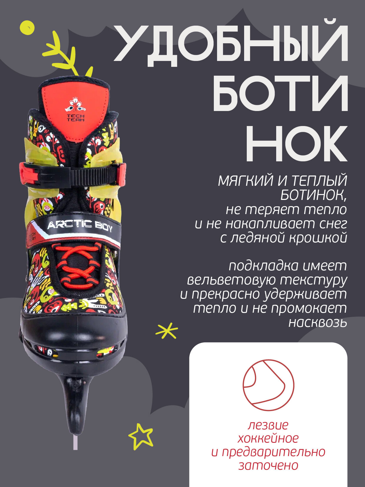 Tech Team Arctic Boy - это мягкие утепленные коньки с регулировкой размера. Размер конька можно легко регулировать вытягиванием носка вперёд, что позволяет использовать его на протяжении нескольких сезонов. Регулировка размера не нарушает баланса при раздвижке и ребёнку не надо привыкать к конькам в новом размере.