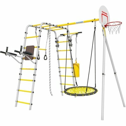 Особенностью данного комплекса является наличие качелей-гнезда размером 80 см. Это не только веселое развлечение, но и эффективный способ развития координации и вестибулярного аппарата ребенка.