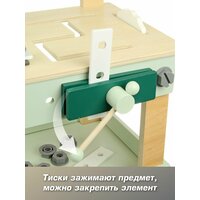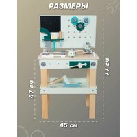 Большое количество предметов, подвижные детали, комфортные для хвата ручки инструментов, доска для записей, эта детская мастерская понравится каждому ребенку. Рабочий столик верстак легко собирается, хороший прокрас предметов. Игровой набор с игрушечными детскими инструментами изготовлен из экологически чистого и безопасного материала, дерева. Деревянные инструменты гладко отшлифованы. Деревянный верстак с продуманной системой крепежа, долговечность и надежность конструкции, хранение на специальной полке приучает к порядку. Детский набор инструментов выполнен в красивой расцветке и стилизованном дизайне. Благодаря детскому верстаку с инструментами ребенок познакомится с работой в домашней столярной мастерской, узнает назначение предметов и научится ими пользоваться. Развивающий игровой набор инструментов детский станет замечательным подарком на Новый год и День рождения. В наборе детали для сборки верстака, пила, отвертка, рожковый ключ, молоток, угольник, 11 элементов для скрутки, 3 шестеренки, 2 кубических элемента, 1 прямоугольный элемент, 13 болтов, 14 гаек. Ключом и отверткой вкручиваем и откручиваем болты. В элементы для скрутки вкручиваются болты с гайками. В шестеренки вставляются болты. В кубические и прямоугольный элементы вкручиваются болты. Можно собрать машинку. Функционал верстака. 1. В отверстия можно вставлять болты, крепить с помощью них различные элементы. 2. В отверстия полочки можно вставить инструменты. 3. На доске можно писать мелом. 4. Пильный диск вращается. Имитация работы с циркулярной пилой. 5. Болт передвигается по дорожке столешницы. 6. Тиски зажимают предмет, можно закрепить элемент. 7. Большая широкая полка нижнего яруса, удобно складывать предметы. Инструменты, элементы для скрутки, шестеренки, кубические и прямоугольный элемент, детали для сборки верстака из МДФ и древесины, болты и гайки из пластика. 49 предметов без учета деталей для сборки верстака. Размеры собранного верстака 45х30х77 см. Высота от пола до столешницы 47 см. Размеры пилы 18х1х8 см. Размеры отвертки 2х12 см. Размеры угольника 15х1х8 см. Размеры молотка 5х3х12 см. Размеры рожкового ключа 15х1х4 см. Размеры шестеренки 7х1 см. Размеры большого элемента для скрутки 18х0,5х3 см. Размеры маленького элемента для скрутки 9х0,5х3 см. Размеры кубического элемента 3х3 см. Размеры болта 3х6 см. Диаметр гайки 3 см. Размеры собранной машинки 7х6х8 см. Размеры коробки 35х8х66 см.