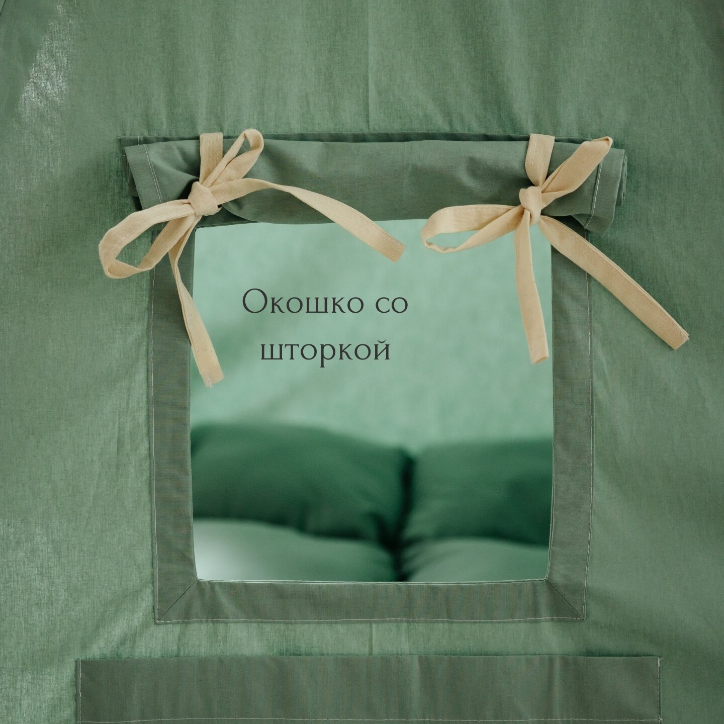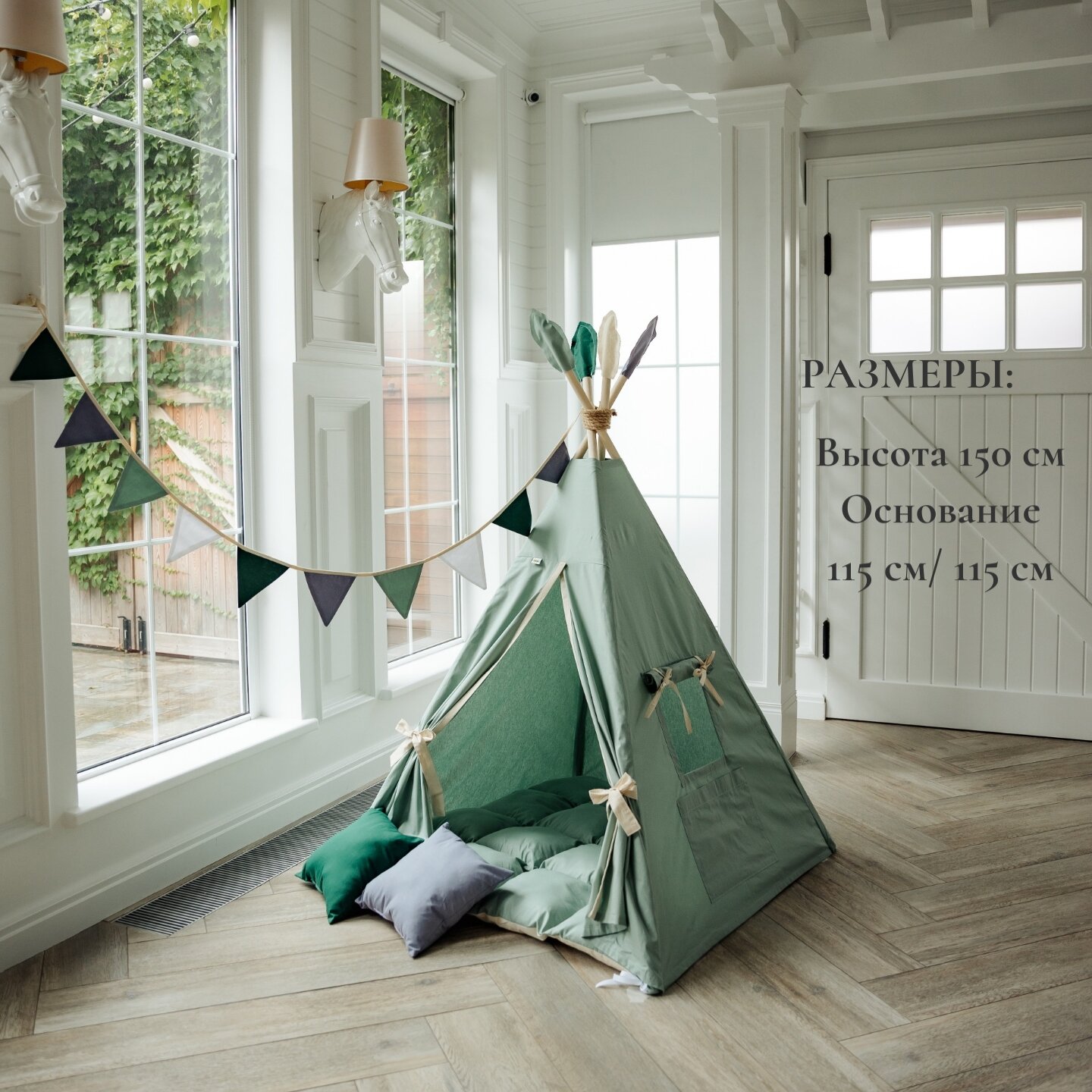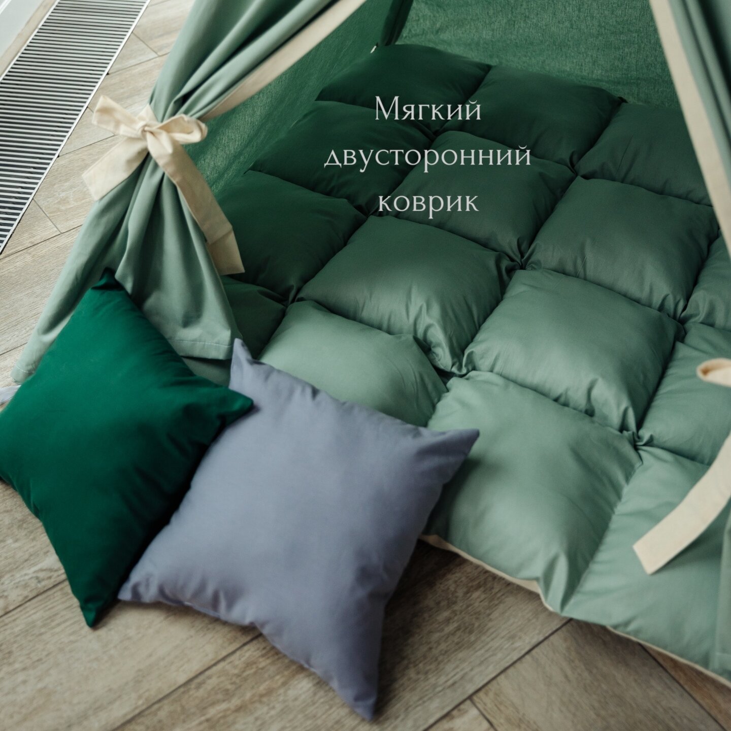 Вигвам на палках с окошком и кармашком для игрушек, пышный коврик бомбон,1 квадратная подушка в цвет вигвама,1 подушка игрушка , флажки-листочки, чехол для хранения, система антискладывания