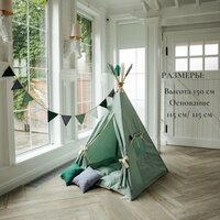 Высота 150 см, основание 115 см,115 см. В вигвам свободно помещается двое деток.