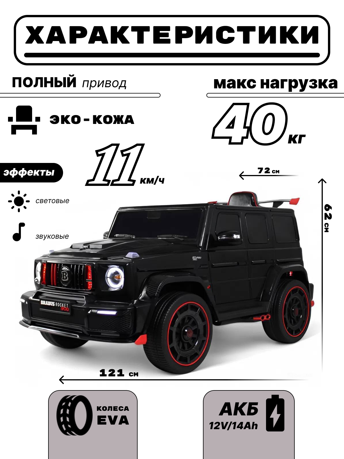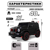 переключение 2WD/4WD (Отдельная кнопка на медиа-панели. При переключении 2WD, передние колеса движутся свободным ходом), управление с телефона с отдельного приложения (скачать можно по QR коду), защита моторного отсека под капотом, чехол в комплекте,карбоновые вставки, педаль тормоза, карбоновый спойлер, подсветка приборной панели, открывается капот, индикатор напряжения аккумулятора , регулируемое, широкое сиденье под рост ребенка ,принцип чемодана, открываются двери