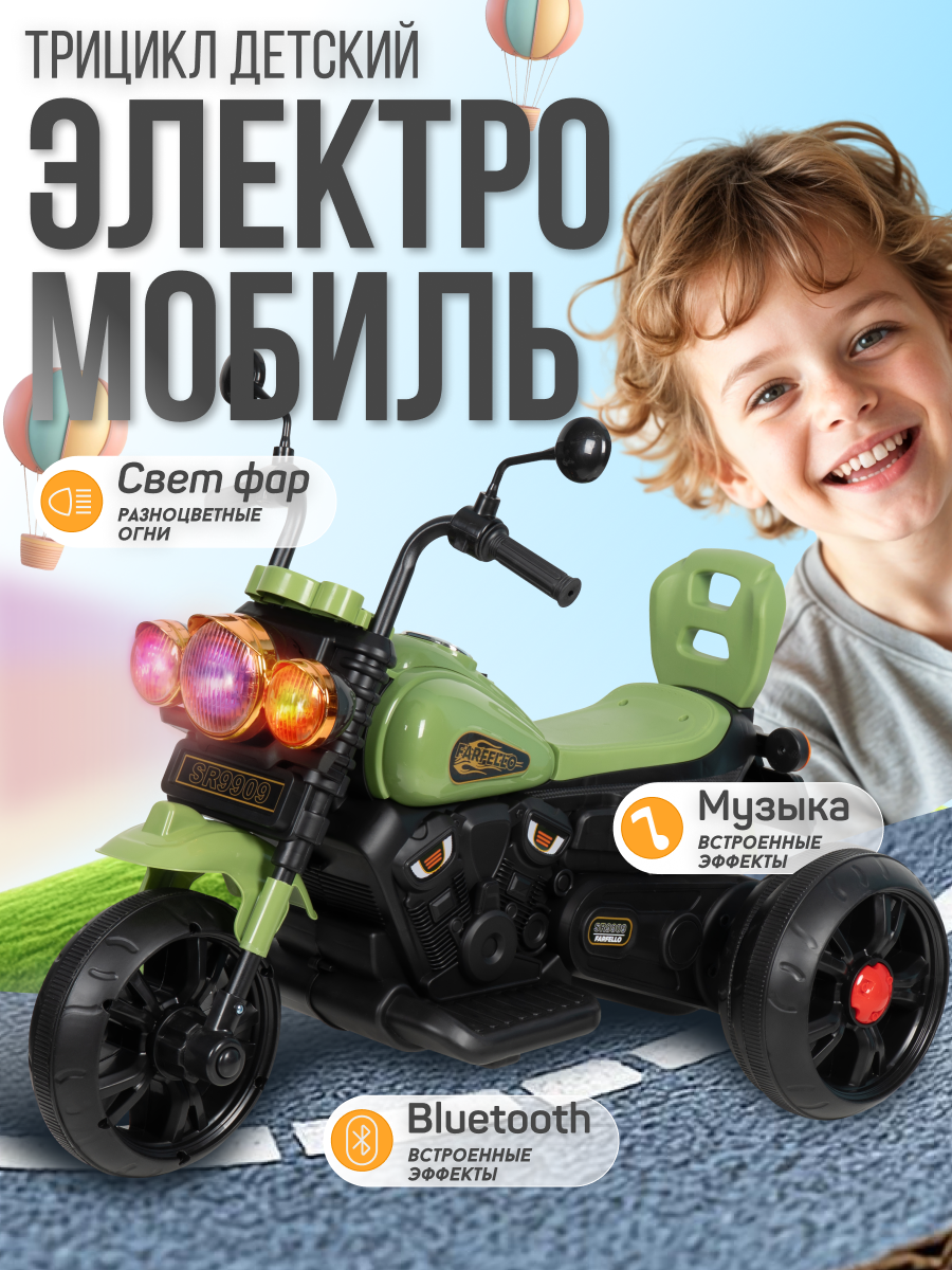 Детский электромобиль мотоцикл для детей Farfello SR9909, зеленый