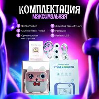 Комплектация включает в себя: цифровую фотокамеру, милый силиконовый ободок-ушки, который светится разными цветами при включении, 3 рулона термобумаги, ремешок для удобного ношения, зарядный кабель Type-С, инструкцию и коробочку.