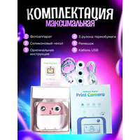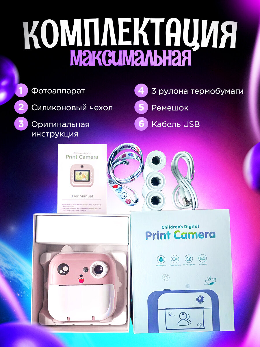 Комплектация включает в себя: цифровую фотокамеру, милый силиконовый ободок-ушки, который светится разными цветами при включении, 3 рулона термобумаги, ремешок для удобного ношения, зарядный кабель Type-С, инструкцию на русском и коробочку.