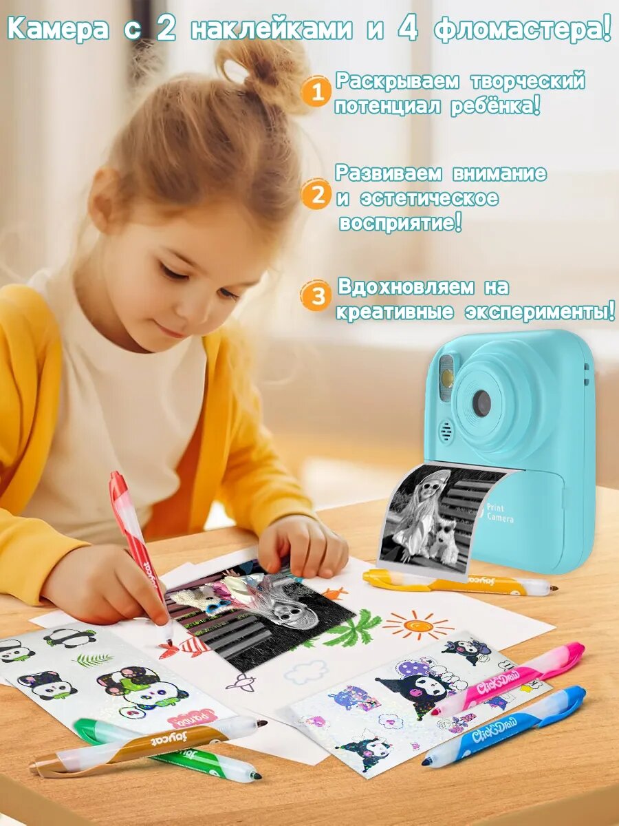 Эта детская фотокамера для мгновенной печати - это помощник для творческих игр 5 в 1, предназначенный для детей в возрасте от 3 до 15 лет. Это не только игрушка, но и хороший помощник в художественном просвещении. В него с привлекательным и живым дизайном, прочным корпусом и простым в использовании пользовательским интерфейсом могут легко играть как мальчики, так и девочки.