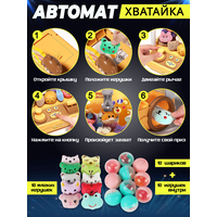 - аппарат ловец игрушек, - наклейки, - USB кабель, - 10 мягких плюшевых игрушек 5 х 4 х 1,5 см, - 10 капсул шариков 3 х 3 см, - 10 пластмассовых игрушек 2 х 2.5 см для наполнения шариков.