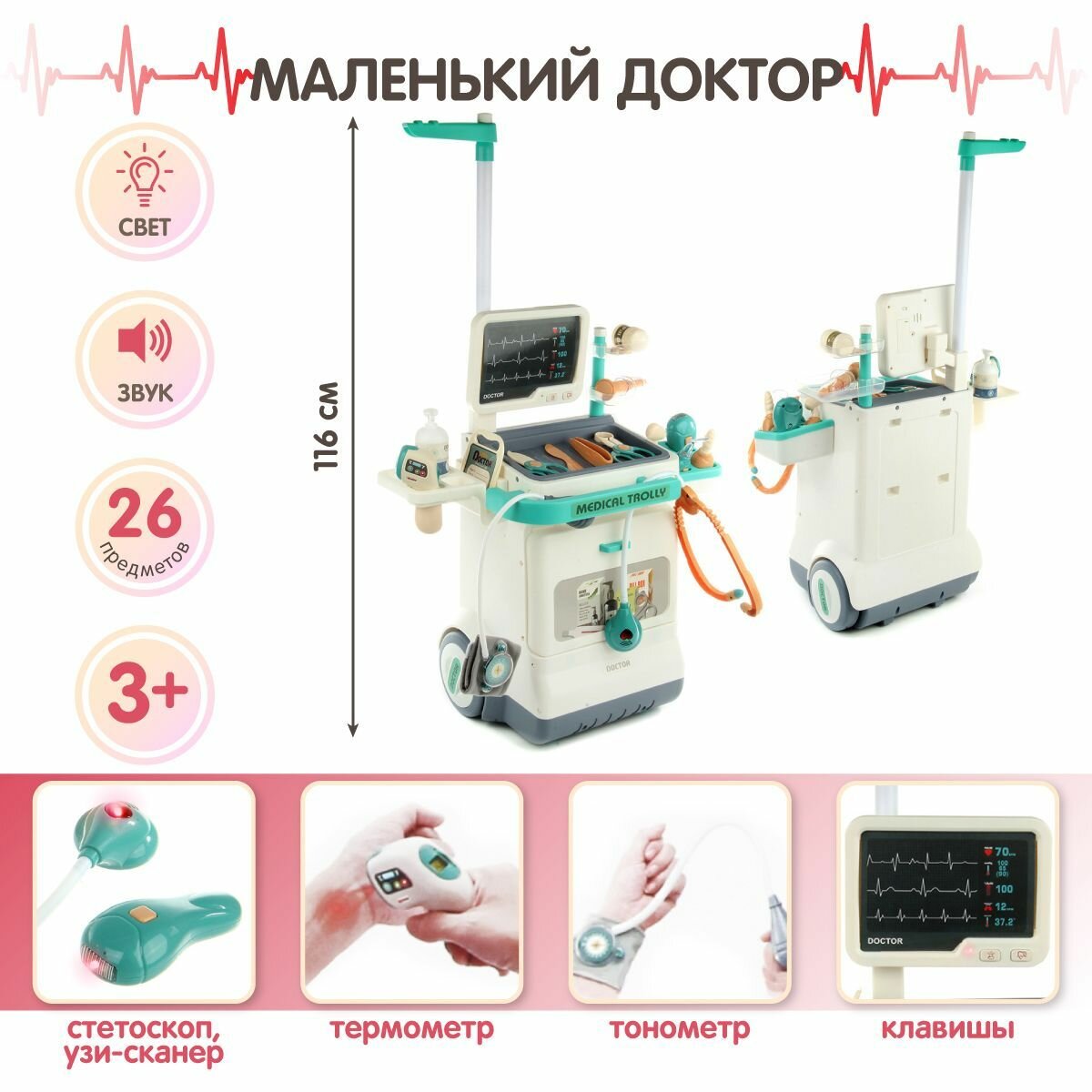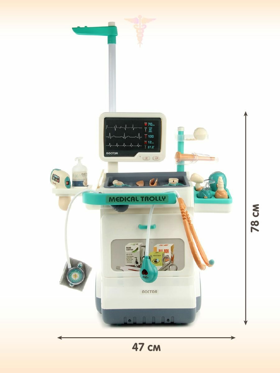 Большой детский игровой набор доктор для сюжетных и ролевых игр. Игрушечный набор врача с аксессуарами имеет большое количество предметов, световые и звуковые эффекты, подарочную упаковку. Игровой центр выполнен в реалистичном дизайне и изготовлен из прочных и долговечных материалов, прослужит много лет. В комплекте 4 карточки, 5 пустых коробочек имитаций лекарств, игрушка стетоскоп, фигурка имитация блистера таблеток, 4 детских медицинских инструмента, термометр, шприц, пинцет, зажим, ножницы, скальпель, медкарта, баночка имитация лекарств, фигурка имитация моющего средства для рук, тонометр, карточка с буквами для проверки зрения, детали для сборки медицинской тележки, набор наклеек. Тележка чемоданчик легко собирается и разбирается, в разобранном виде занимает мало места. Чемоданчик катается вперед и назад, есть отсек для хранения предметов. Много удобных полочек для всех предметов. У ножниц и зажима сходятся и расходятся ручки. У шприца двигается поршень. Термометр при нажатии на кнопку издает писк, подсвечивается красным лампочка, при прокрутке колесика меняется значение температуры. У одонтоскопа при нажатии на кнопку подсвечивается красным имитация зеркала. Дужки стетоскопа растягиваются, подойдет практически для любого размера головы, при нажатии кнопки на головке издает звук сердцебиения, вставка в виде сердечка подсвечивается красным. У тонометра при сдавливании груши крутится диск с числовыми показателями, манжета на липучке, расстегивается. У врачебного инструмента лазера при нажатии кнопки подсвечивается белым светом прозрачная вставка. Функционал планшета. При нажатии кнопки мигалки издает звук скорой. При нажатии кнопки кардиограммы издает звук сердцебиения, лампочка слева от кнопки с мигалкой подсвечивается красным. Карточки можно вставить в планшет. Планшет с трубкой крутятся на 360 градусов, трубка выдвигается, телескопическая. Такая ролевая игрушка для детей, как и набор стоматолога, станет замечательным подарком детям, как мальчику, так и девочке, на новый год, день рождения, 8 марта или 23 февраля. 26 предметов. Планшет работает от 2 батареек ААА, не входят в комплект. Термометр работает от 2 батареек LR44, входят в комплект. Одонтоскоп работает от 2 батареек L1130, входят в комплект. Лазер работает от 2 батареек L1130, входят в комплект. Стетоскоп работает от 2 батареек LR44, входят в комплект. Подарочный набор юный доктор выполнен из полимера. Размеры собранной тележки 47х28х78 см. Высота с выдвинутой трубкой 116 см. Высота от пола до столешницы 36 см. Размеры стетоскопа 15х3х47 см. Размеры медкарты 9х10 см. Размеры ножниц 6х1х10 см. Размеры коробочки санитайзера 4х4х8 см. Размеры картинки для планшета 16х13 см. Размеры манжеты в развернутом виде 21х6 см. Длина трубки тонометра, учитывая грушу 33 см. Размеры термометра 6х4х11 см. Размеры шприца в полную высоту 4х3х12 см. Размеры коробки 46х12х37 см.