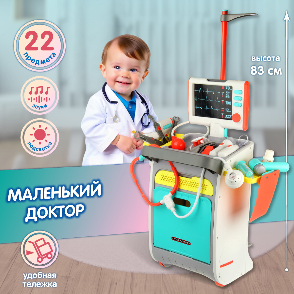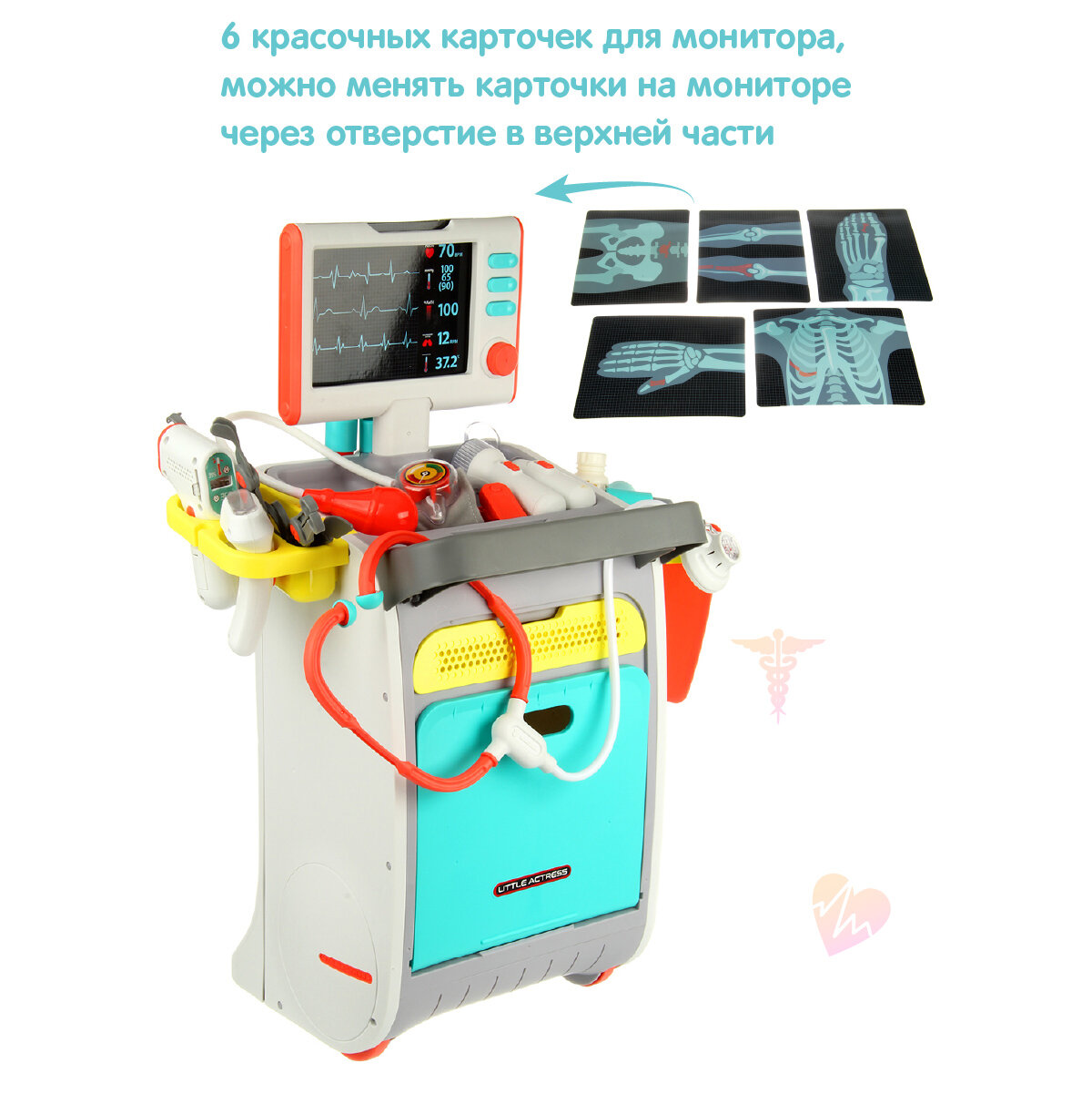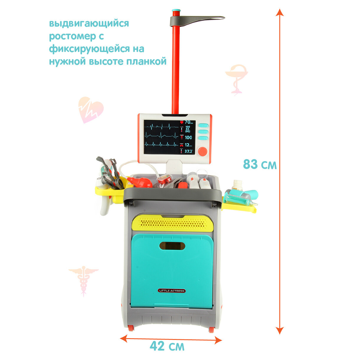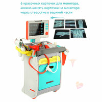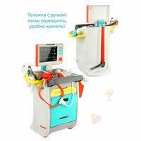 Большой игровой набор доктора для сюжетных и ролевых игр с игрушечными врачебными инструментами, медицинской тележкой и эффектной подсветкой. Детский медицинский набор выполнен в реалистичном дизайне и яркой расцветке, изготовлен из прочных и долговечных материалов. В игрушечный набор врача с аксессуарами входят детали для сборки тележки, стетоскоп, тонометр, градусник, сканер, фонарик, 2 врачебных инструмента, 2 зажима, ножницы с закругленными краями, скальпель, шприц, планшет, баночка, прищепка, 6 картонных карточек, инструкция по сборке тележки, набор наклеек. Тележка катается назад и вперед, имеет вместительный отсек и удобную ручку. Детская развивающая игрушка умеет проигрывать песни, звуки ЭКГ и звонка, короткую мелодию и взмах волшебной палочки. Сканер, градусник и врачебное зеркало подсвечиваются. Карточки для монитора легко меняются. Ростомер выдвижной, с фиксирующейся планкой, удобно измерять рост ребенка. Стетоскоп издает звук сердцебиения, вставка с кардиограммой подсвечивается. Игрушечный набор врача с аксессуарами станет замечательным подарком детям, как мальчику, так и девочке, на Новый год и День рождения. Благодаря такому подарочному набору юного доктора ребенок познакомится с медицинскими инструментами, выучит их названия, узнает, как ими пользоваться. Монитор работает от 2 батареек АА, не входят в комплект. Фонарик работает от 2 батареек LR44, градусник от 3 батареек LR44, сканер от 2 батареек LR44, инструмент с зеркальцем от 2 батареек LR44, стетоскоп от 2 батареек LR44, батарейки входят в комплект. 22 предмета без учета тележки. Изготовлено из полимера. Размеры тележки с опущенным ростомером 42х31х58 см. Размеры стетоскопа 14х3х56 см. Размеры манжеты тонометра в разложенном виде 22х7 см. Размеры груши тонометра 4х8 см. Размеры шприца 5х3х9 см. Размеры коробки 48х12х41 см.