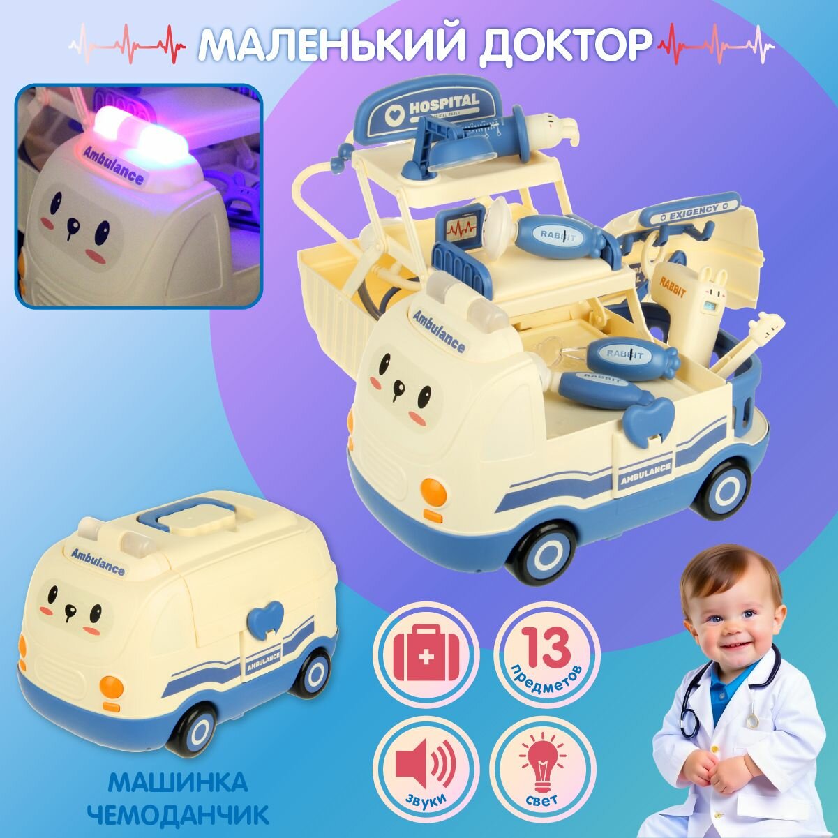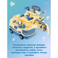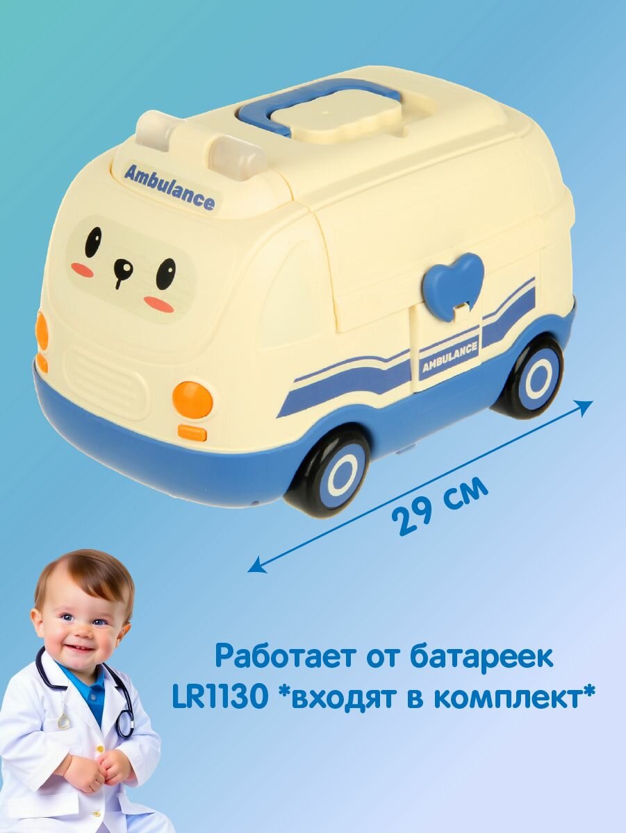 Детская развивающая игрушка 2 в 1, детский медицинский набор и машинка скорая помощь. Игровой набор доктора для сюжетных и ролевых игр со световыми эффектами, выполнен в милом дизайне и яркой расцветке. Подарочный набор юный доктор изготовлен из прочных и долговечных материалов, игрушечные врачебные инструменты безопасны для ребенка. В комплекте машина с допэлементами, стетоскоп, градусник, 3 врачебных инструмента, шприц, лоток, ножницы, очки, 2 пилюльки, пинцет, наклейки. Машинка катается вперед и назад, имеет большой отсек для инструментов, все предметы легко помещаются в игрушечный транспорт. Проблесковые маячки подсвечиваются, транспорт издает звук сирены. Стетоскоп издает звук сердцебиения, пилюльки разбираются. Стетоскоп, градусник, инструмент с круглой частью и врачебное зеркало подсвечиваются. Игрушечный набор врача с аксессуарами станет замечательным подарком детям, как мальчику, так и девочке, на Новый год и День рождения. 13 предметов без учета аксессуаров в транспорте. Мигалка работает от 3 батареек LR1130, лампа от 2 батареек LR1130, стетоскоп от 2 батареек LR1130, врачебное зеркало от 2 батареек LR1130, врачебный инструмент с круглой частью от 2 батареек LR1130, градусник от 2 батареек LR1130, все эти батарейки входят в комплект. Полимер. Размеры машинки в разложенном виде, как на фото 39х36х26 см. Размеры в собранном виде без учета ручки 29х19х18 см. Размеры стетоскопа 12х2х54 см. Размеры градусника 9х3х10 см. Размеры очков в разложенном виде 13х13х5 см. Размеры пилюльки 5х2 см. Размеры коробки 30х19х17 см.