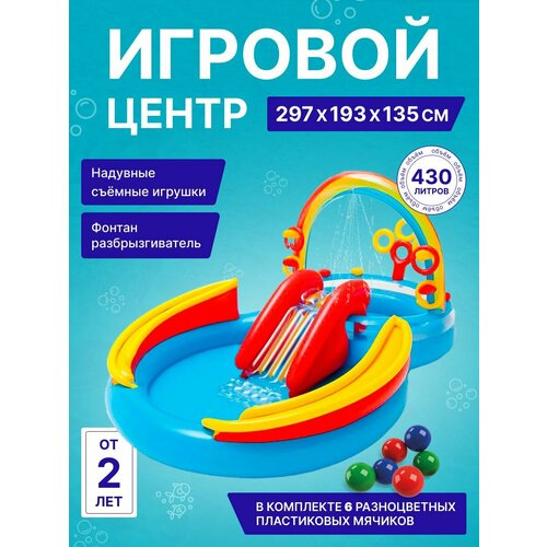 - Размер - 297 х 193 х 135 см. Игровой центр состоит из двух бассейнов. Первый бассейн: объём 227 литров, высота бортика 25 см. Второй бассейн: объём 201 литр, высота бортика 17 см.