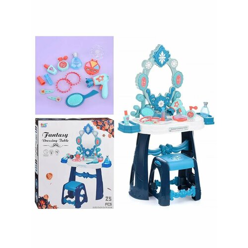 Детский игрушечный Игровой набор стилиста для девочки. Детский игровой набор для сюжетно-ролевых игр, который поможет ребёнку развить разные навыки. Развивает моторику рук, эмоциональное восприятие, мелкую моторику и воображение, координацию движений, фантазию и социально-бытовые навыки. Подходит для игр дома, для проведения занятий в детском саду. Можно использовать для игр в коллективе с другими детками. Такой набор вызовет у малыша массу положительных эмоций и увлечет его надолго, позволяя маме отдохнуть. Так кроха освоит социальные роли, получит новые знания о важных профессиях, станет внимательнее и заботливее. • Размеры набора: 51х24.5х74.5 см.\n• Высота от пола до столешницы: 40 см.\n• Размеры стула: 18х16х22 см.\n• В зеркале можно увидеть своё отражение, при включении играют мелодии и горят огоньки (подсветка может работать без музыки).\n• В комплекте:\n- фен с механическим моторчиком (9.5х6х13 см.)\n- расчёска, 2 заколки, 2 браслета, 4 баночки. помада.\n• Свет и звук работают от 3-х батареек "АА" (не входят в комплект).\n• Материал: пластик.\n• Соответствует требованиям безопасности и стандартам качества продукции.\n• Для детей от 3-х лет.
