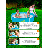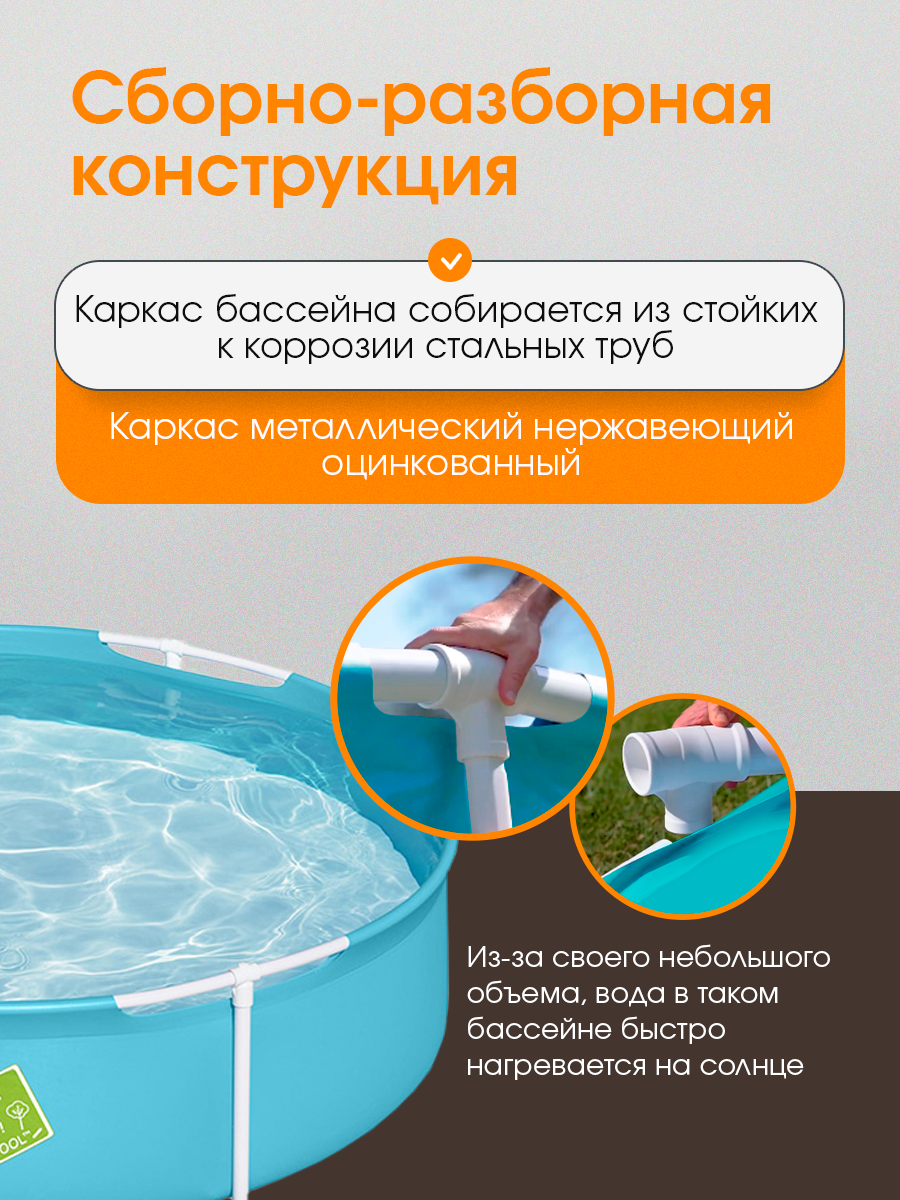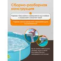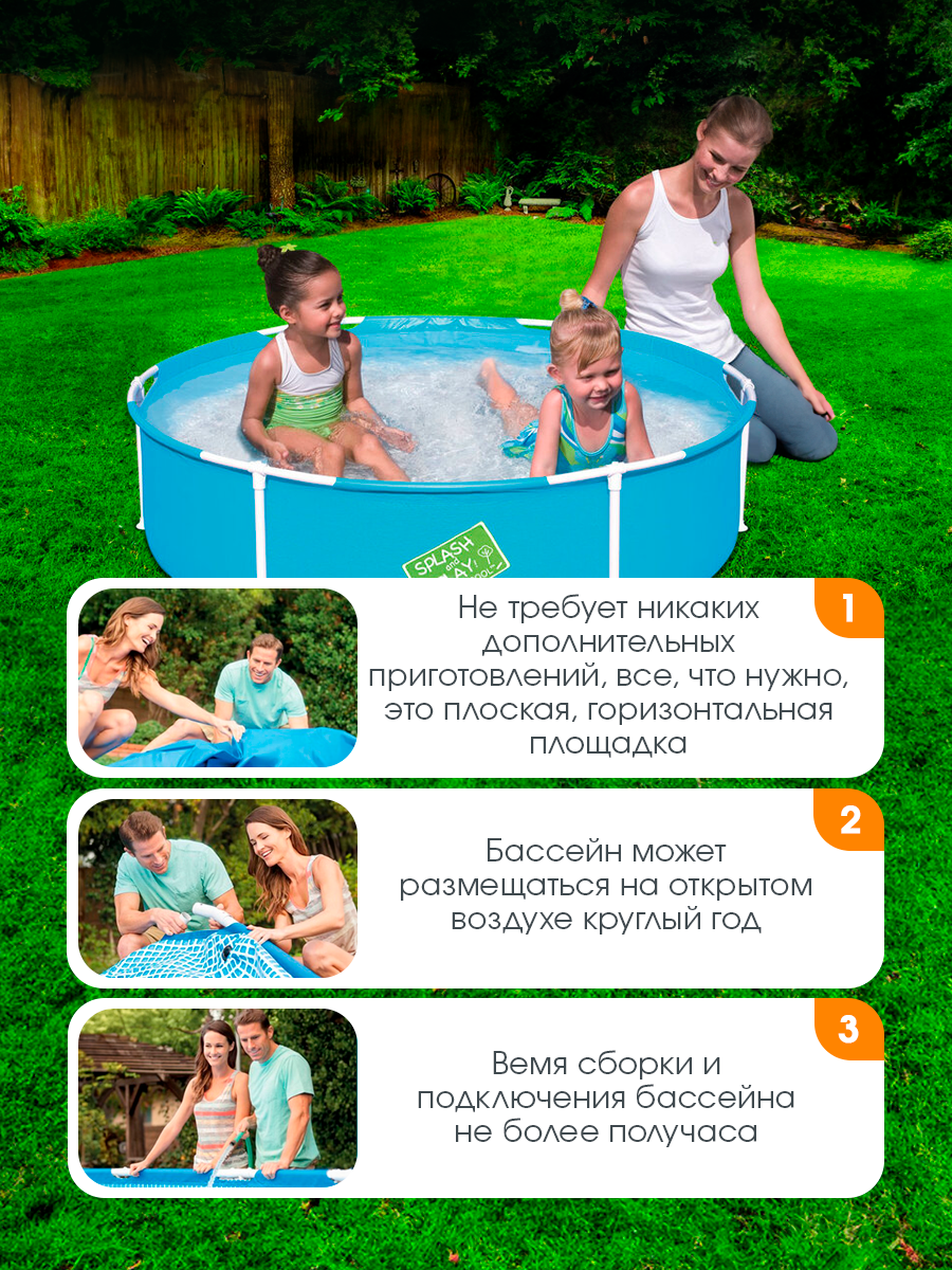 Особенностью данного бассейна является его простая и быстрая установка. Металлический нержавеющий оцинкованный каркас позволяет быстро собрать и подключить бассейн, что займет не более получаса вашего времени.