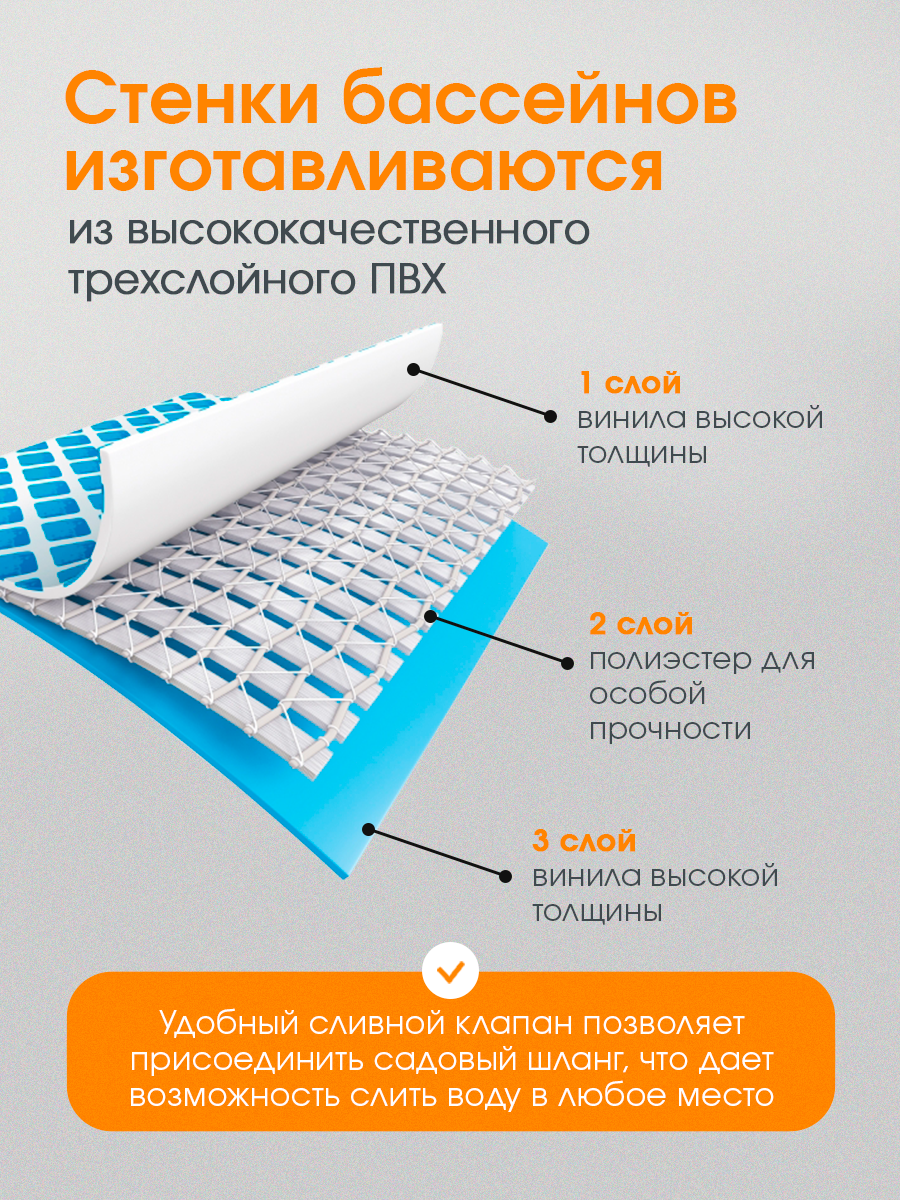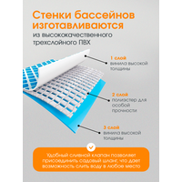 Чаша бассейна изготовлена из высококачественного трехслойного ПВХ, состоящего из двух слоев плотного винила и одного слоя полиэстера. Это обеспечивает прочность и долговечность изделия.