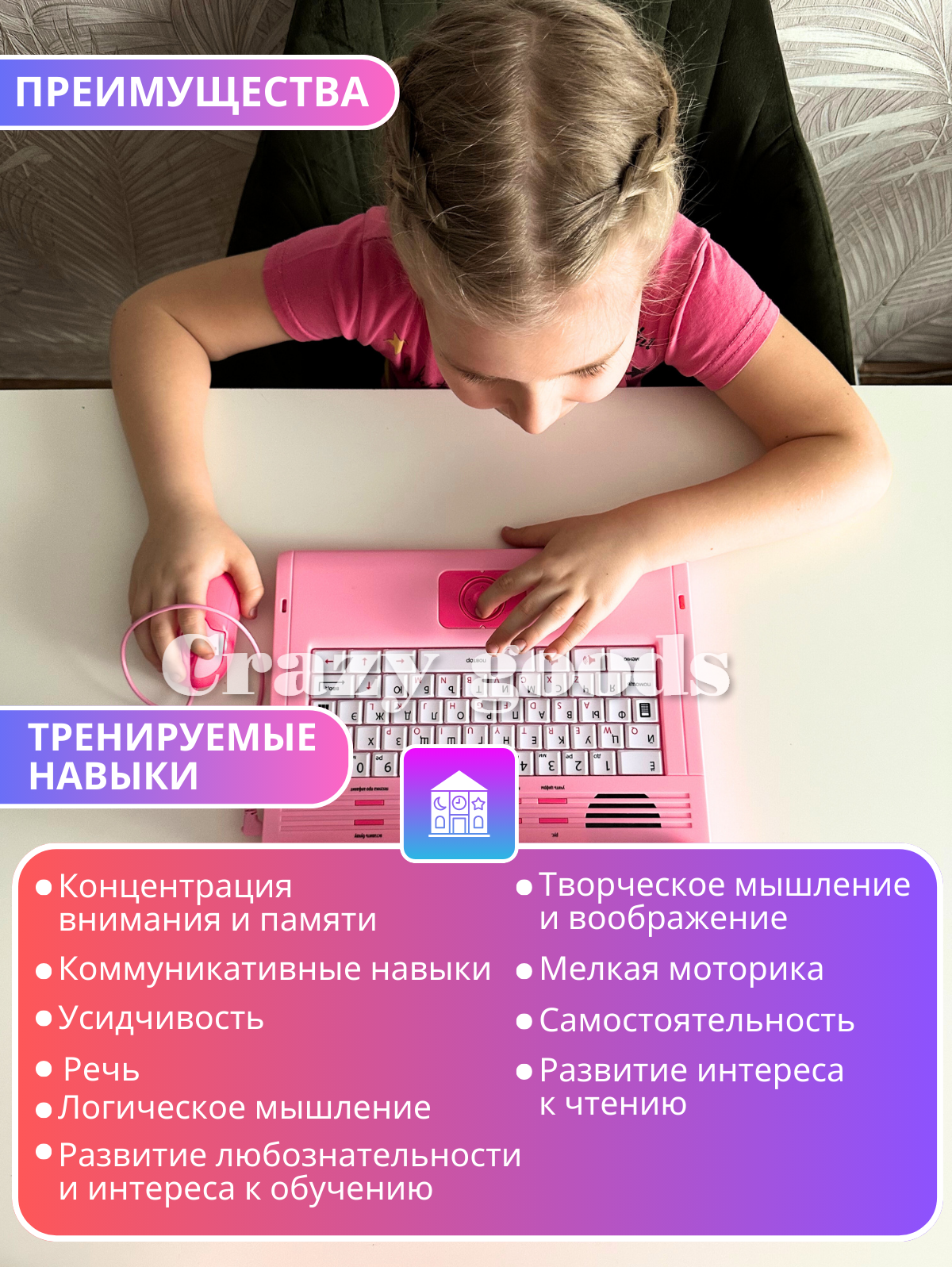 Детский обучающий и развивающий ноутбук это умная книга и настоящая находка для родителей и детей от 3 лет до 9 лет. Электронный учебник предоставит вашему ребенку интересные задания, упражнения и развлечения, которые превратят процесс учёбы в увлекательное приключение каждый день.