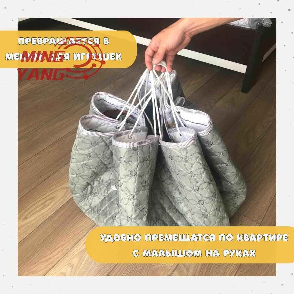 Удобство в использовании: по краям коврика есть колечки, через которые можно протянуть верёвку (идёт в комплекте). Потянув за верёвочку, коврик собирается в мешок для игрушек, а все предметы, которые были на коврике, остаются внутри.