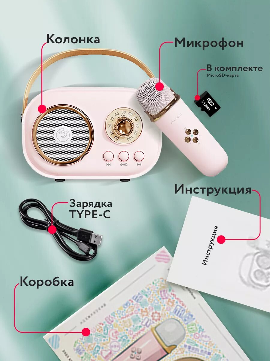 Представляем новую, инновационную мини караоке-систему для маленьких певцов и певиц. Малыш будет не только развлекаться, но и развивать множество разных навыков. Пение замечательно тренирует связки, улучшает вокал, стимулирует дыхательную систему, развивает слух, память и учит выступлению перед публикой. А игра с микрофоном - улучшит моторику рук, внимание и воображение - ребенок будет представлять себя звездой на сцене! Радость детей и любовь к вам будет безгранична. Это большое счастье наблюдать, когда детки прыгают, веселятся и поют. В комплекте поставляется - Аудиосистема, Микрофон, Карта памяти, зарядный кабель USB Type-C (тайп си) и Инструкция на Русском языке в индивидуальной упаковке. Отличный подарок детям от 4 до 14 лет на день рождения. Караоке оснащен функцией Bluetooth 5.1, дальность соединения 10-15 м. Легко подключаются смартфоны и планшеты на Android и IOS. А штатный слот для micro SD позволяет закачать заранее подготовленные минус треки и пользоваться гаджетом без подключения к телефону или интернету. Савбуфер встроенный выдает приятные низы и подчеркивает басы. Микрофончик сделан из качественных радиоэлементов, встроено 6 масок изменения звука для веселого праздника, и не искажает голос при чистом пении. Параллельно используется как портативная акустическая колонка с сабвуфером. Ваши мальчики и девочки будут наслаждаться клубным звуком, где бы они не были! Представьте, как ваши дети поют свои любимые песенки, их голоса звенят чисто и ярко, а вы сидите рядом и радуетесь их талантам! Благодаря крепкому корпусу из abc-пластика и компактному размеру, музыкальную колоночку можно брать с собой в любое путешествие - на дачу, во двор, на речку, на море или на пикник. Или же применять дома - подключить к телевизору или законнектить к компьютеру. Покупка нашего караоке - это решение для родителей, которые хотят не только развлечь своих детей, но и помочь им развить свои музыкальные навыки. ЭТО НЕ просто игрушка, ЭТО инвестиция В ИХ будущее!
