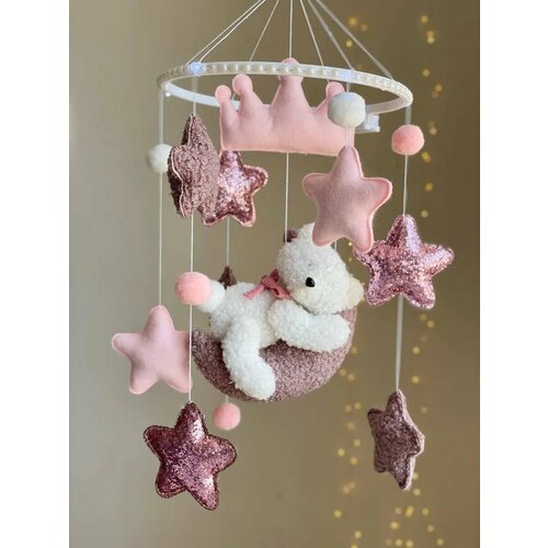 Мобиль с подсветкой в кроватку ручной работы. Уникальная игрушка мобиль для новорожденных, способна убаюкать, успокоить и занять малыша, пока родители заняты своими делами. С месяца ребенок учится фокусировать внимание на предмете и получает первые знания о контрастности и движении. Мобиль из фетра ручной работы выполнен из гипоаллергенных материалов: корейского фетра, блеск из кожзама, наполнитель холлофайбер. Диаметр основы с игрушками 20 см, высота 35-40 см. Надежное и прочное крепление подвески в кроватку гарантирует спокойствие родителей за ребенка. Мобили, это система подвесок с мягкими игрушками, размещенными на пластмассовой основе. Упакован мобиль в подарочную крафт коробку, хорошо подойдет для подарок на выписку или рождение малыша. Рекомендации по уходу: Сухая чистка мягкой щеткой для одежды, сухая чистка липким роликом для одежды, влажная чистка влажной салфеткой. Запрещено: отбеливать, стирать в стиральной машине, выжимать, сушить на батарее. Мобиль, это система подвесок с мягкими игрушка для кроватки, размещенными на деревянным или пластмассовом круге. Мобиль крепится на бортике в кроватке и имеет поворотный механизм. Вращение мобиль может сопровождаться музыкой. Крепление подходит для круглых и прямоугольных кроваток. Наш мобиль, это полностью ручная работа, мы производим мобиль из фетра самого высокого качества. Мобиль в кроватку музыкальный можно использовать до 1-2 лет. Мобиль в кроватку из фетра будет шикарным подарком на выписку из роддома