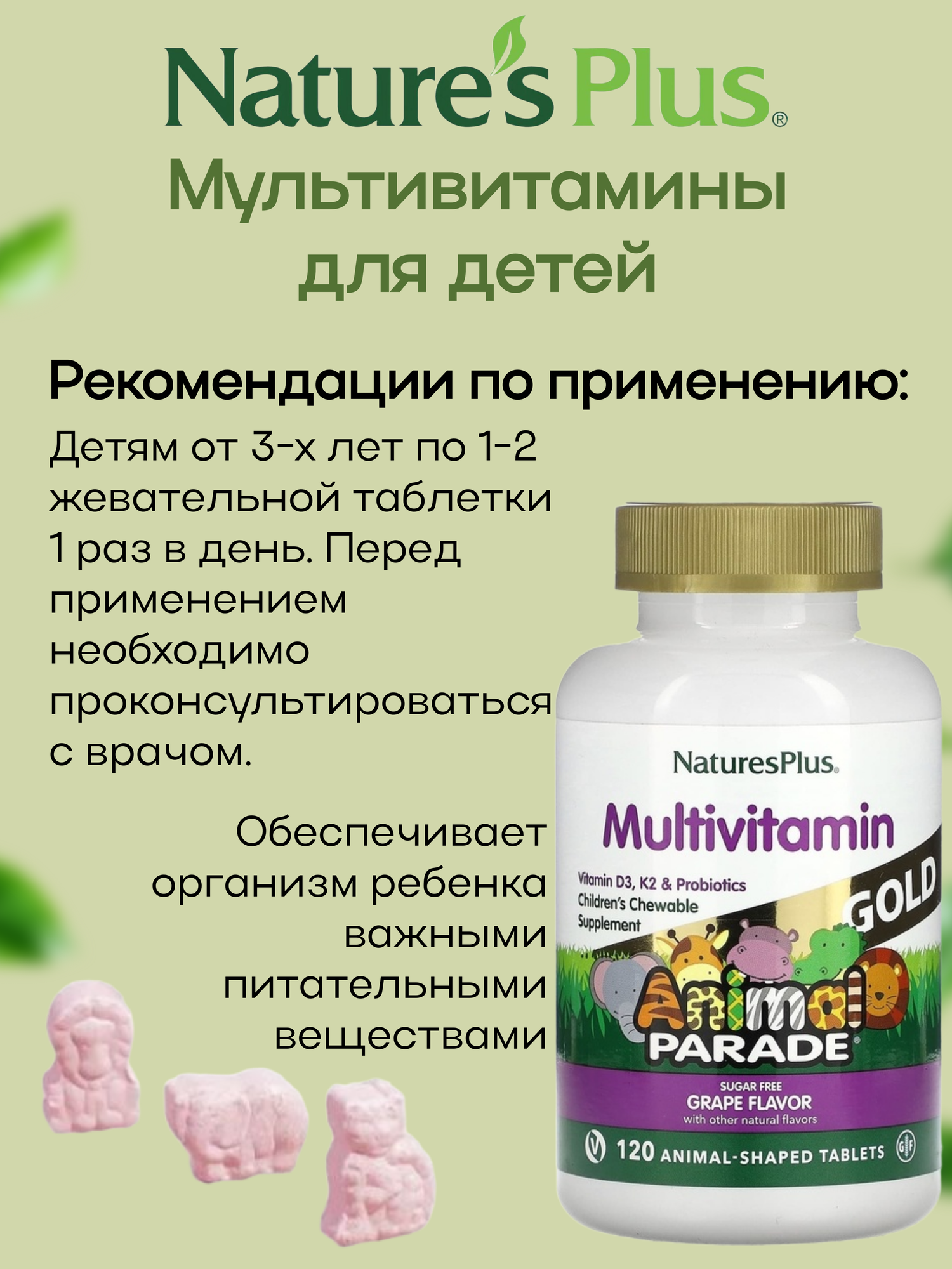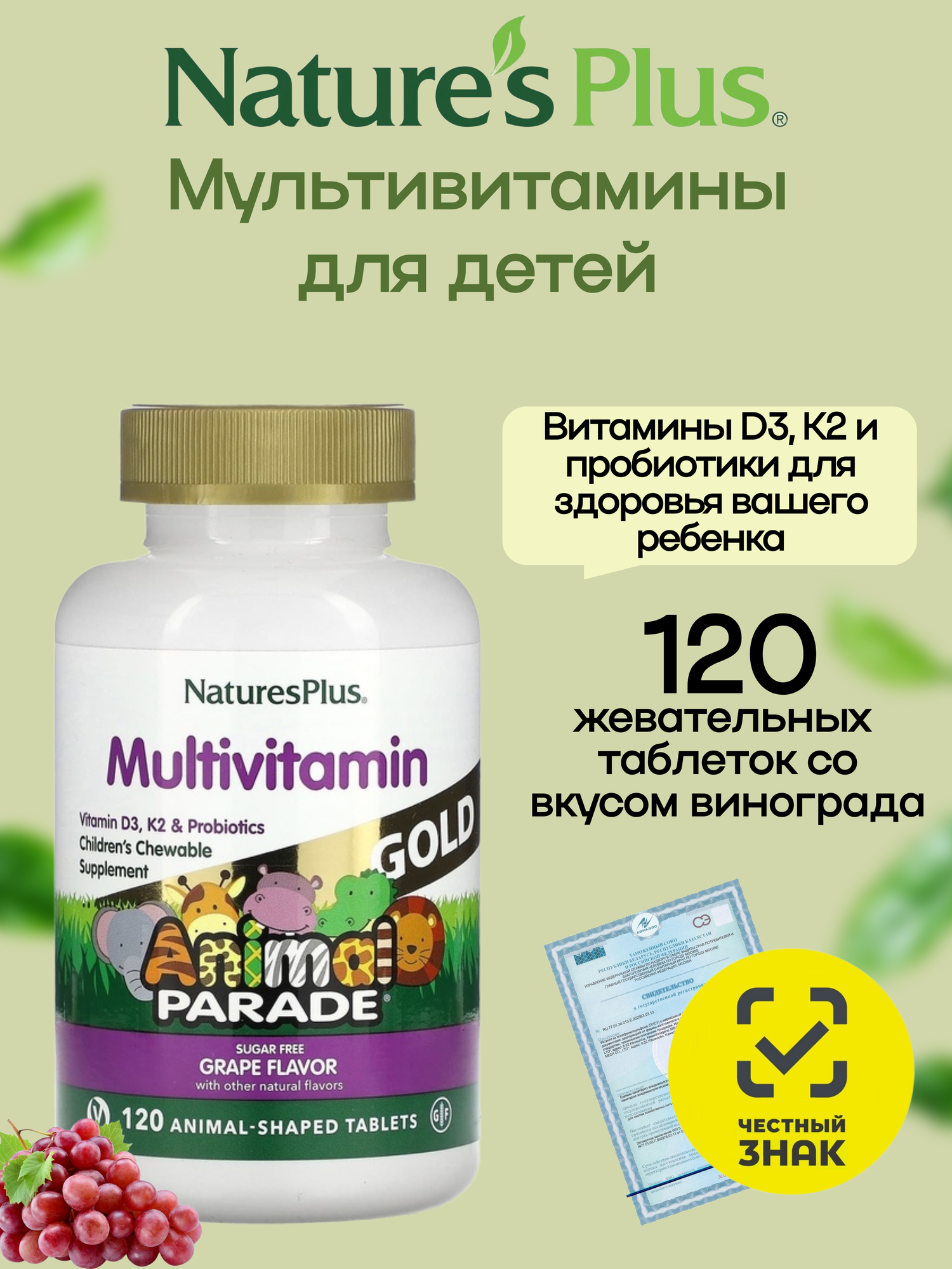 Детский мультивитаминный комплекс Natures Plus Animal Parade GOLD Multi, 120 жевательных таблеток со вкусом винограда: сравнение цен, характеристики, фото, актуальное наличие и цены.