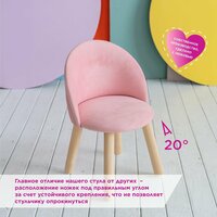 Детский стул мягкий от компании TODI, отлично подойдёт для детей в возрасте от 3 до 6 лет. Мягкая обшивка делает стул очень удобным для творческих занятий ребёнка, а современный дизайн стульчика, сделает его украшением любой детской комнаты. Обшивка стула выполнена из мебельного велюра. Высота ножек 28,5см, высота с сидением 32см. Общие габариты: 30х35х55 см. Ножки стула находятся под углом, это делает стул очень устойчивым. В комплекте идут войлочные подпятники, для комфортного нахождения стула на любой поверхности. Ножки стула сделаны из массива берёзы. Детский стул – это качественная и комфортная мебель для маленьких детей и малышей. Стульчик обычно имеет мягкое сиденье и спинку, что позволяет ребенку чувствовать себя комфортно и уютно. Такой стул в нашем магазине выполнен в различных цветах , что позволит вам подобрать его к любому дизайну и интерьеру детской комнаты. Детский мягкий стул подойдет для чтения книг, игр или просто отдыха. Он также может быть использован для создания уютного уголка в комнате.