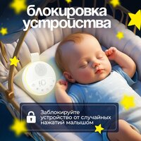 Это устройство для новорождённых поможет создать атмосферу полного расслабления и глубокого сна. У данного генератора белого шума есть источник мягкого тёплого света, яркость которого можно регулировать с помощью кнопки «солнышко». Хотя максимальная яркость не заменит основной источник света в детской или спальне, она может пригодиться во время пеленания или ночного кормления.