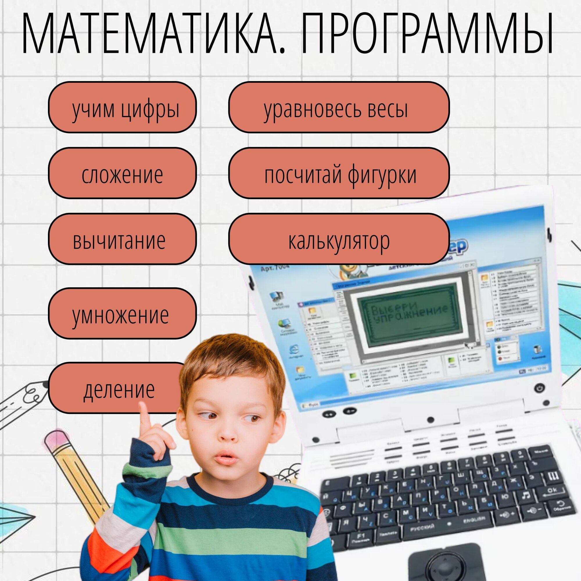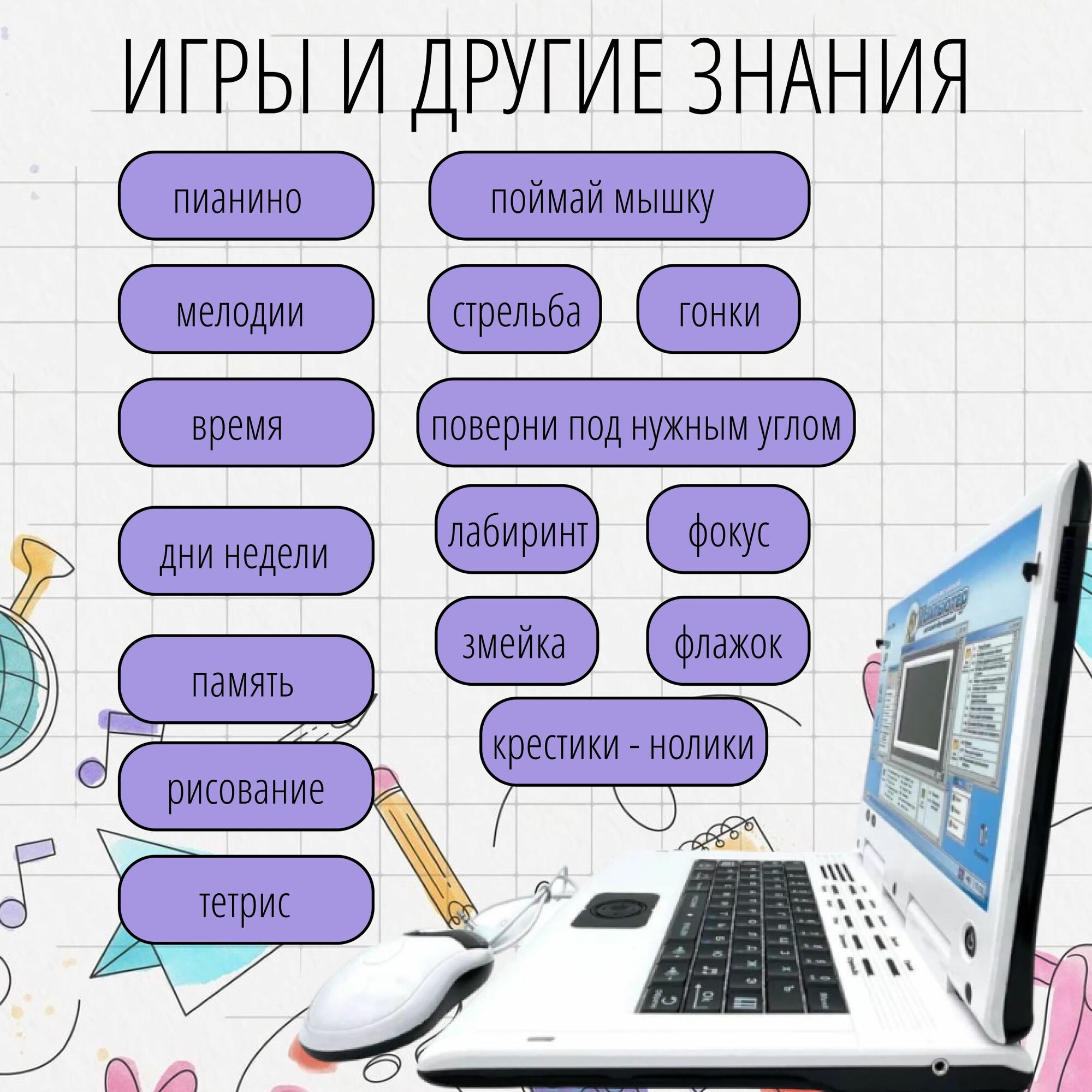Представляем вам замечательную игрушку - развивающий компьютер. Этот детский ноутбук - идеальный подарок для юных девочек и мальчиков, ведь он прекрасно сочетает в себе развлечение и обучение. Данная игрушка специально разработана для детей от года до семи лет, чтобы развивать и обучать их с самого раннего возраста! Наш новый развивающий компьютер - это замечательный способ превратить день рождения вашего ребенка в праздник обучения и игры. Научите вашего малыша распознавать цифры и буквы на русском и английском языке, а также узнавать алфавит и знакомиться с первыми словами. Отличается своей функциональностью и простым управлением, что делает его идеальным для самостоятельных занятий без вмешательства взрослых. Наш новый развивающий компьютер имеет черный цвет. Благодаря своему яркому и узнаваемому дизайну этот новый компьютер мгновенно станет любимой штучкой для вашего ребенка. Он будет идеальным спутником для прогулок или игр с друзьями! Наш развивающий компьютер - это не просто игрушка. Он оснащен музыкальными кнопками, чтобы добавить еще больше веселья и интерактивности в игровой процесс. Детский обучающий компьютер для мальчика с большим экраном, разработан специально для эффективной дошкольной подготовки 35 функций Батарейки в подарок. Размер экрана 10 см на 6 см. С его помощью ребенок с легкостью подготовится к школе и приобретет множество новых знаний, разных умений и навыков. Он составлен на русско-английском языке, что способствует тренировке детской памяти и мышления, а также логики и внимания. На уроках грамматики есть задания, где нужно найти буквы или расставить их в алфавитном порядке. Бывает нужно собрать слово или выучить синонимы и антонимы. Математика дает возможность изучать цифры и простые действия умножения и деления, сложения и вычитания. Этот развивающий ноутбук невероятно функционален, потому что с ним можно научиться определять время или выучить дни недели